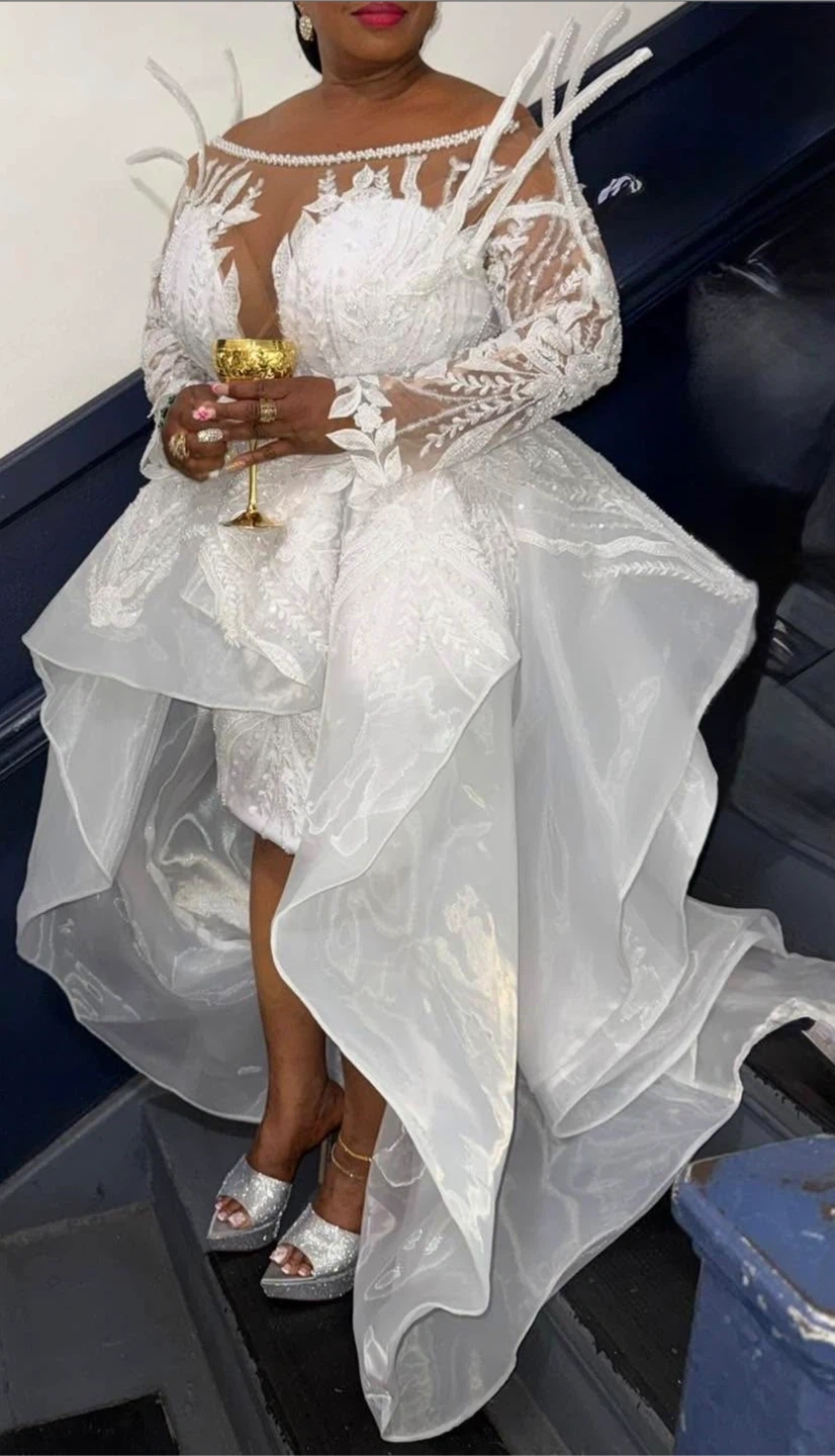 Beautiful white wedding dress with intricate lace detailing on the bodice and sleeves. It features a sheer neckline and a voluminous organza overlay skirt. Stunning statement sleeves with feather accents add a dramatic flair. Perfect for a bride seeking a unique and elegant gown!