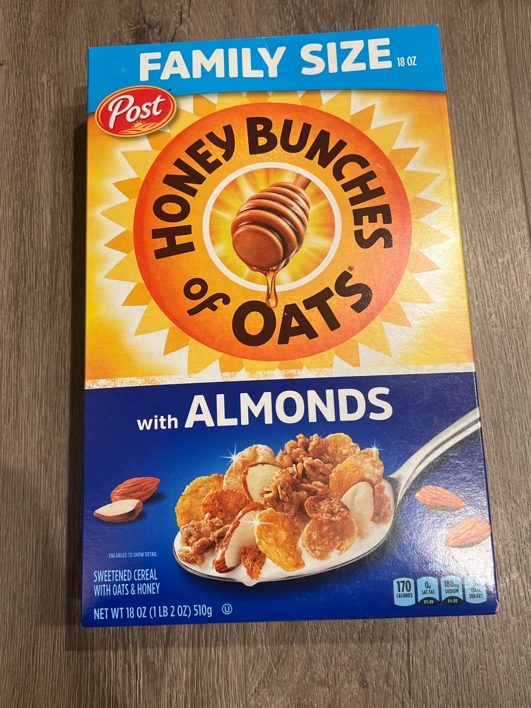 This is Post Honey Bunches of Oats cereal with almonds. It's a family size box. Sweetened cereal with oats & honey.