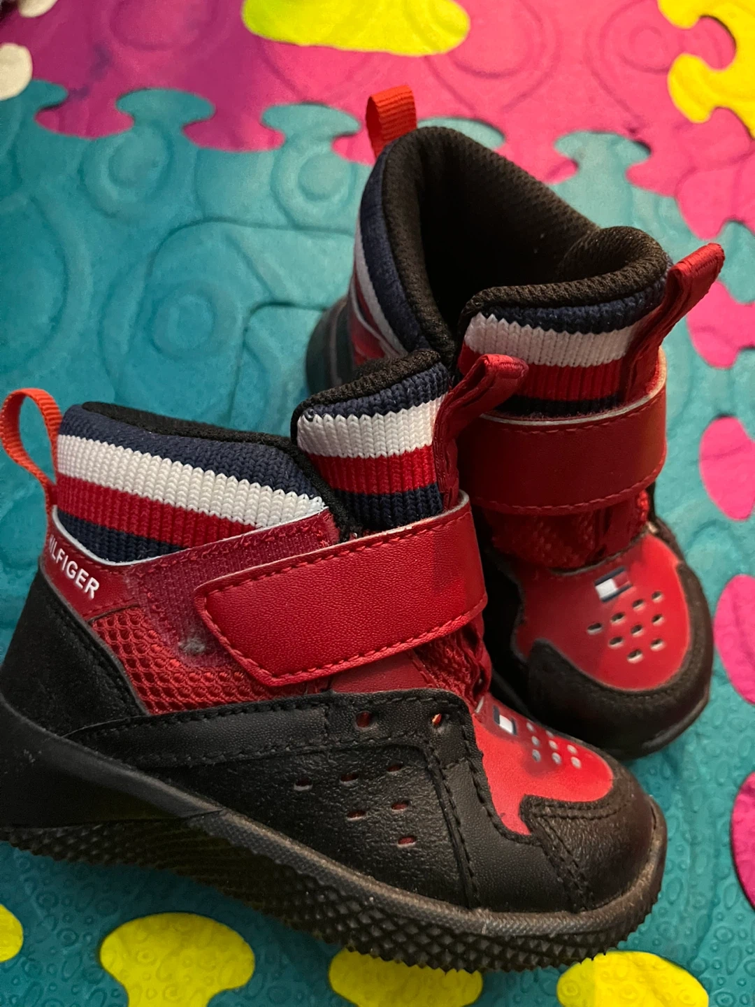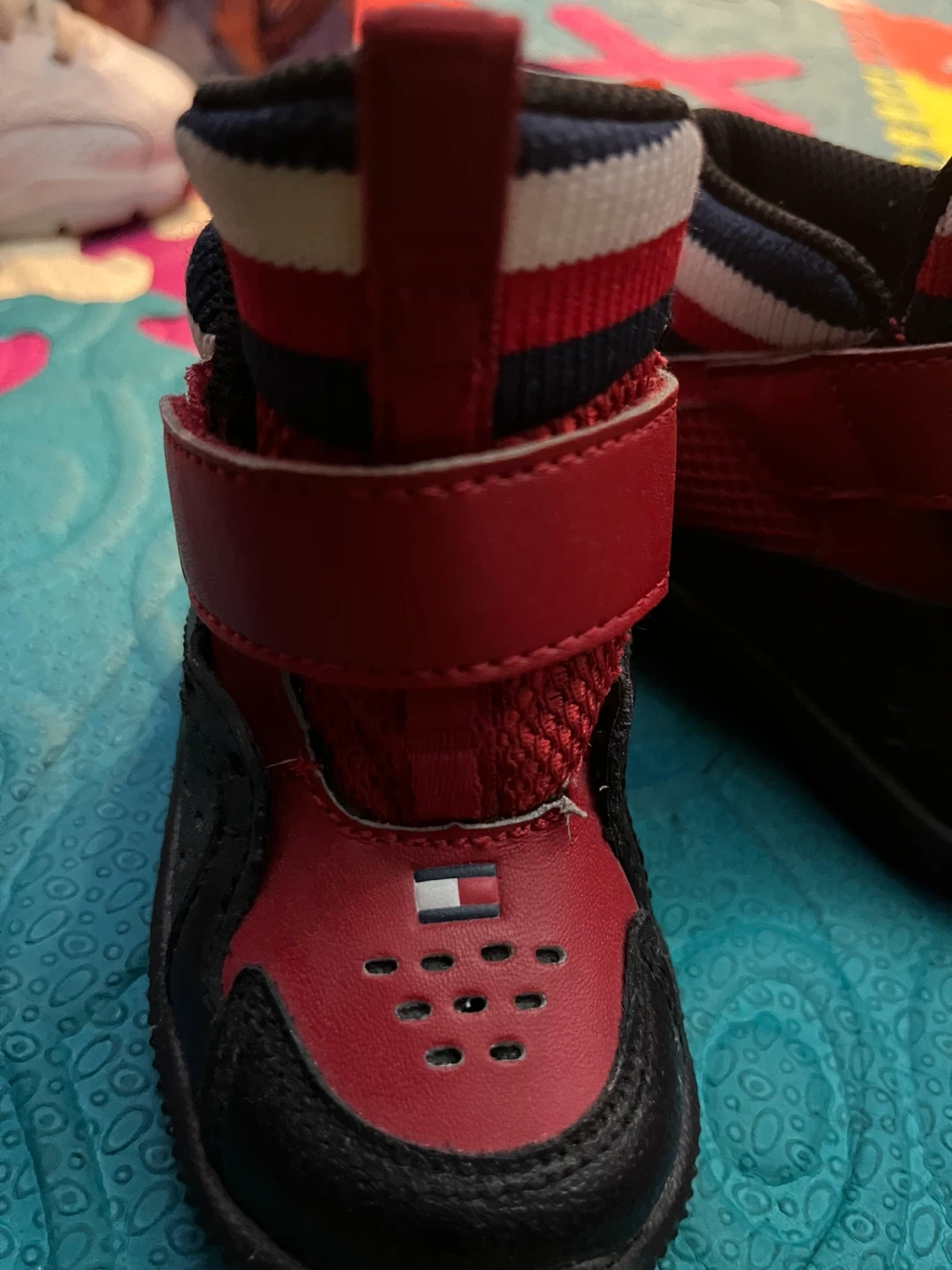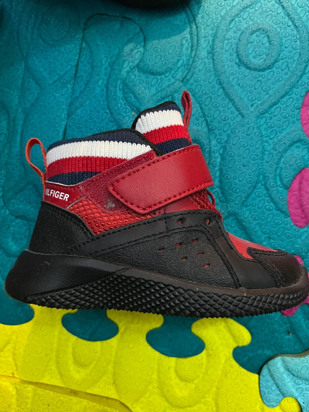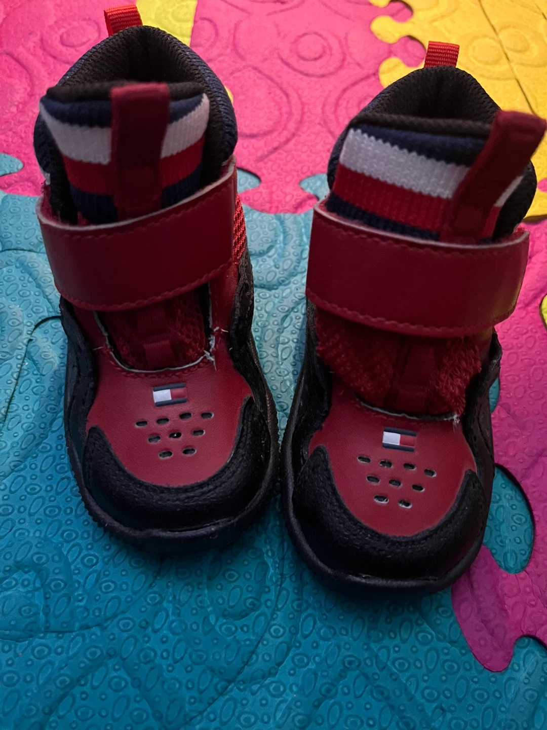 Toddler's Tommy Hilfiger sneaker boot in red and black. Features a hook-and-loop strap closure for easy on and off. Red, white, and blue striped collar detail. Size 5. Never worn