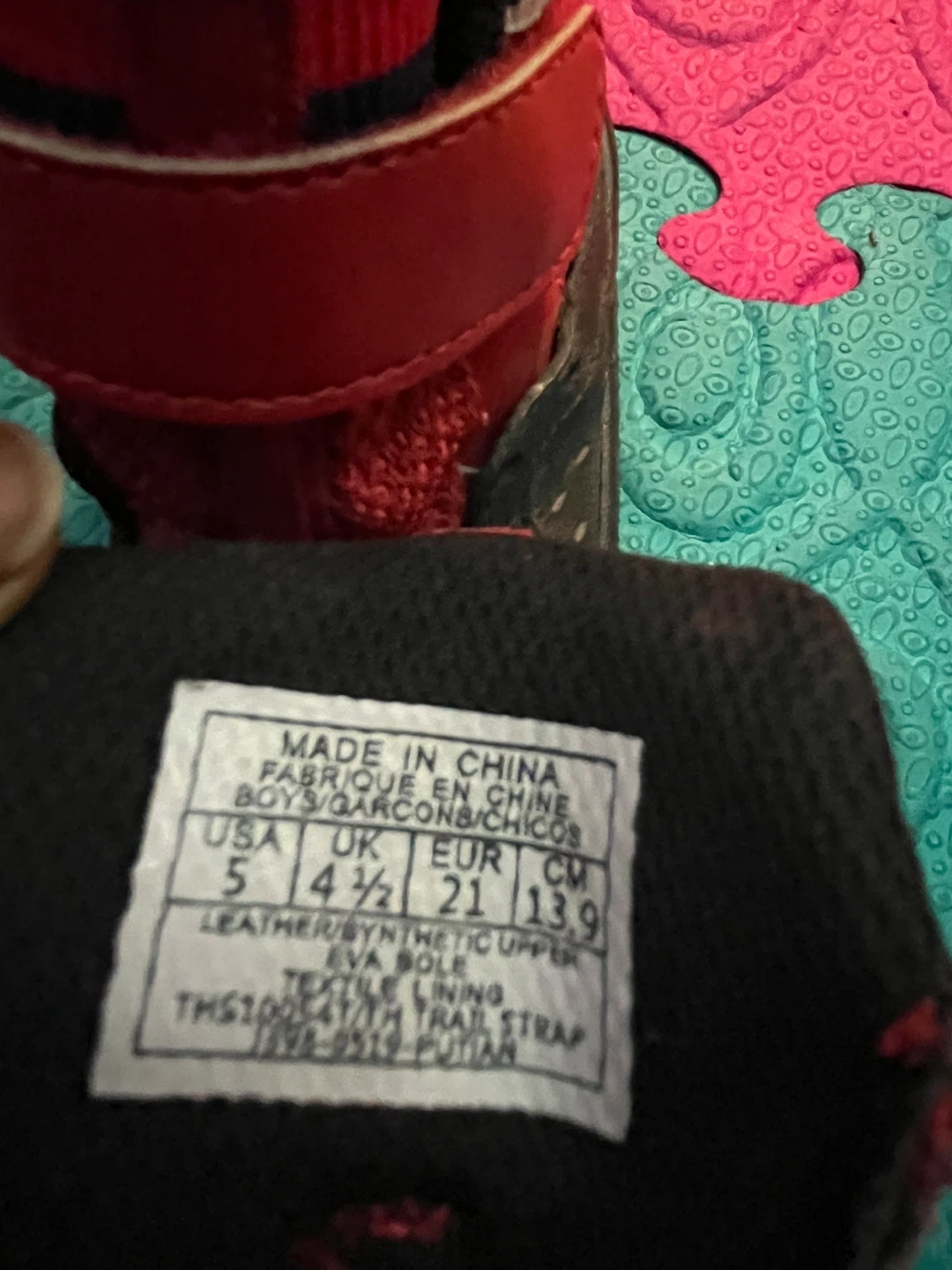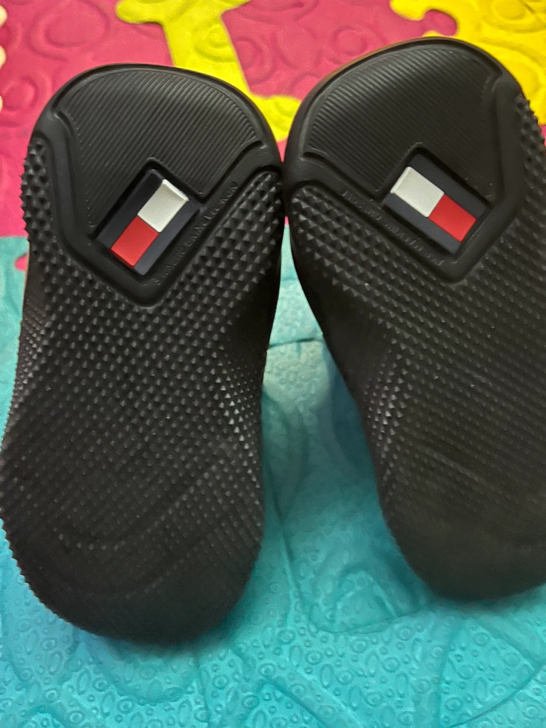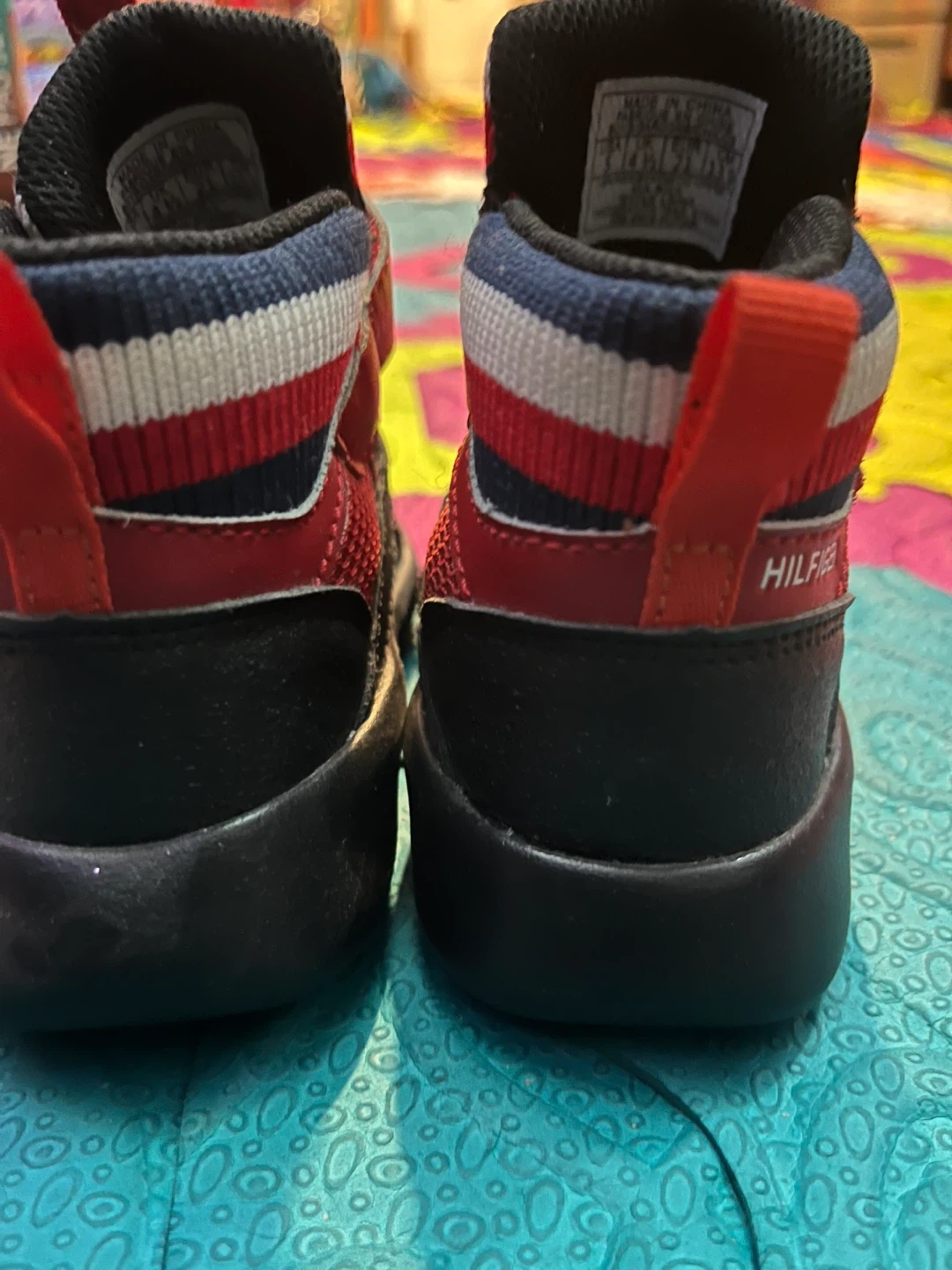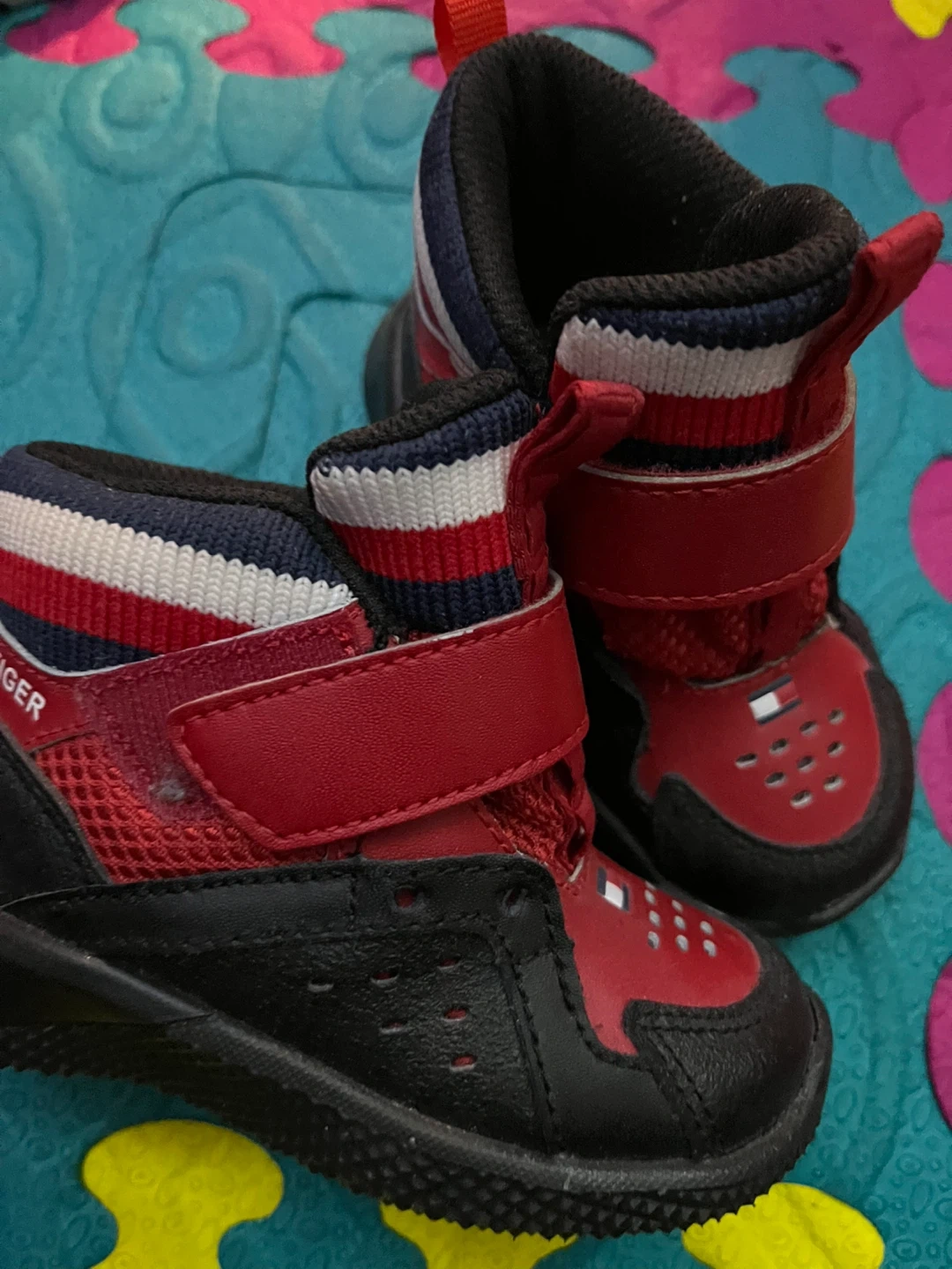 Toddler's Tommy Hilfiger sneaker boot in red and black. Features a hook-and-loop strap closure for easy on and off. Red, white, and blue striped collar detail. Size 5. Never worn
