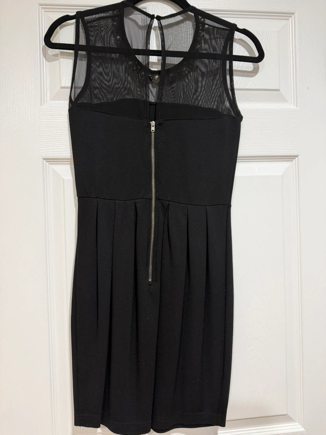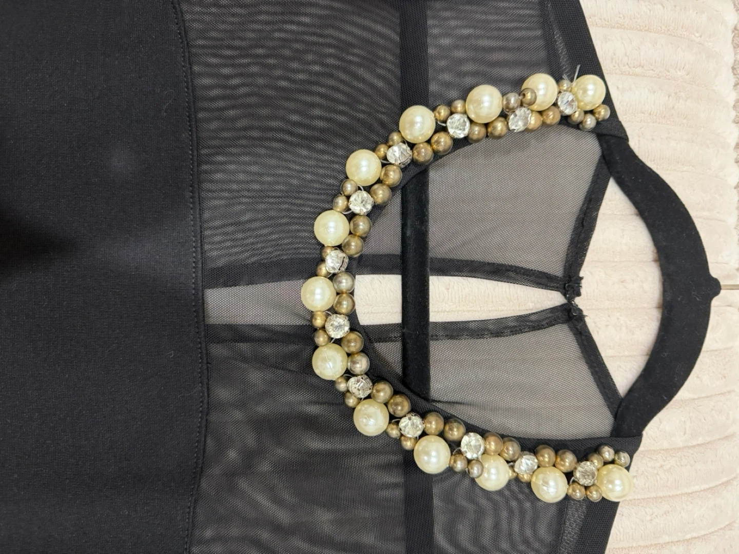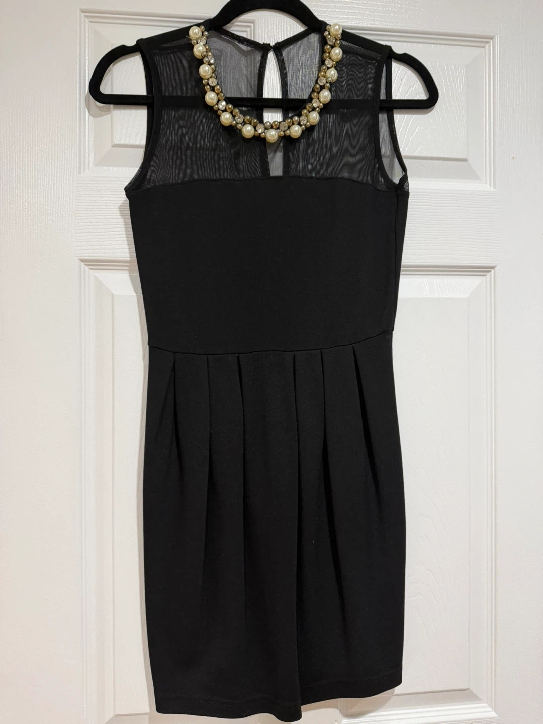 Sleeveless black dress with a sheer mesh neckline adorned with pearls and rhinestones. Features a hidden back zipper and pleated skirt detail. Perfect for a night out!