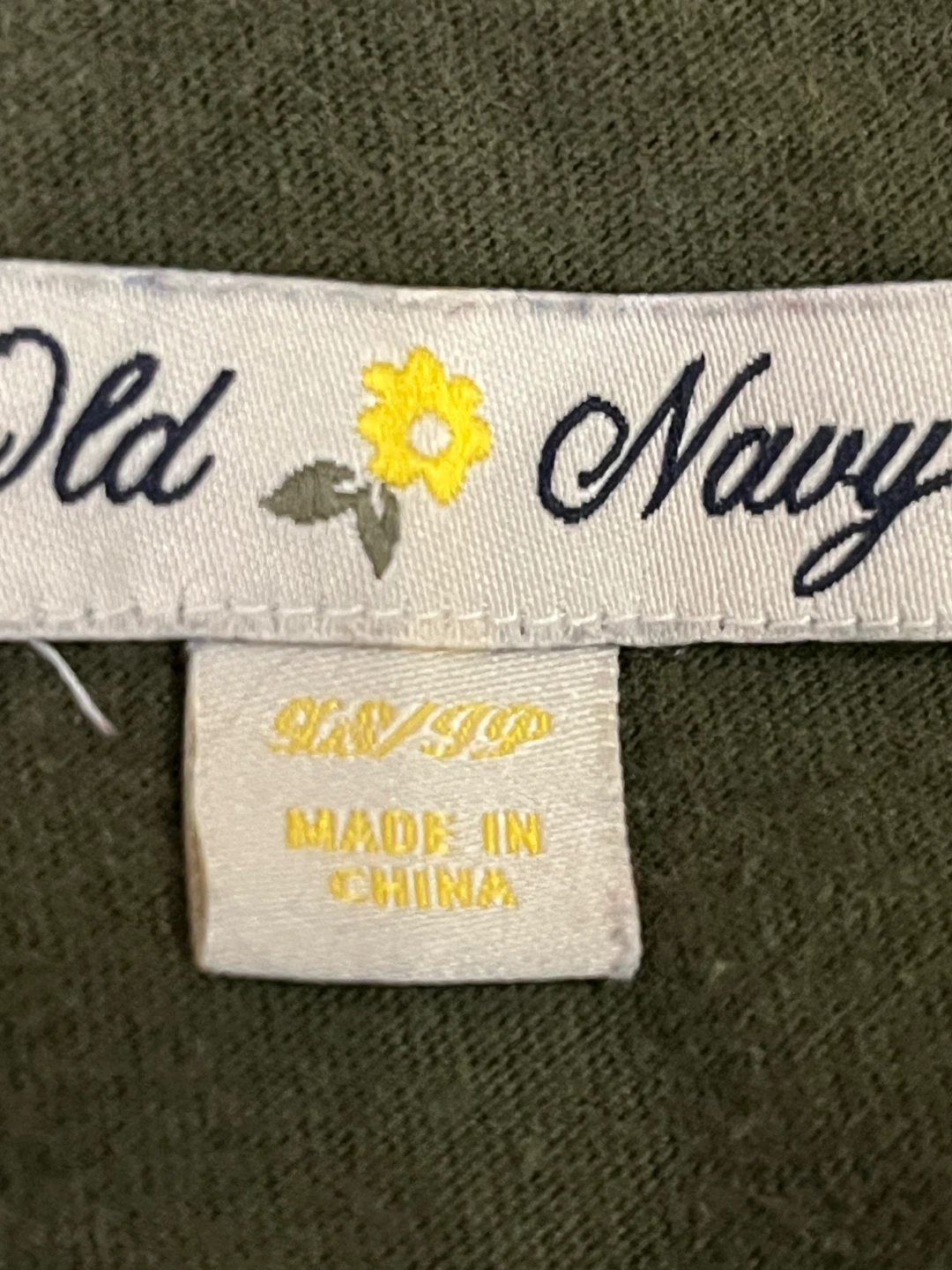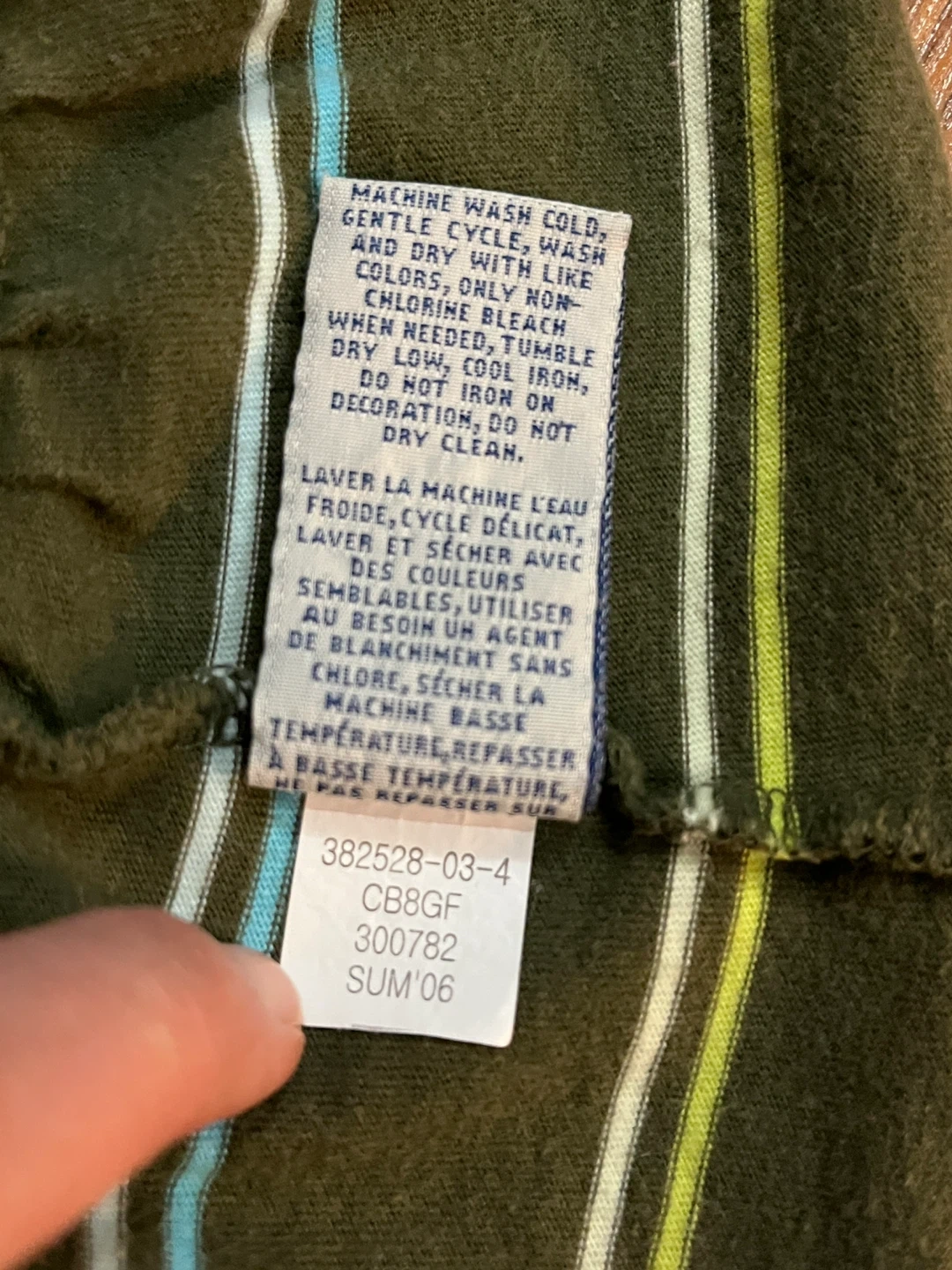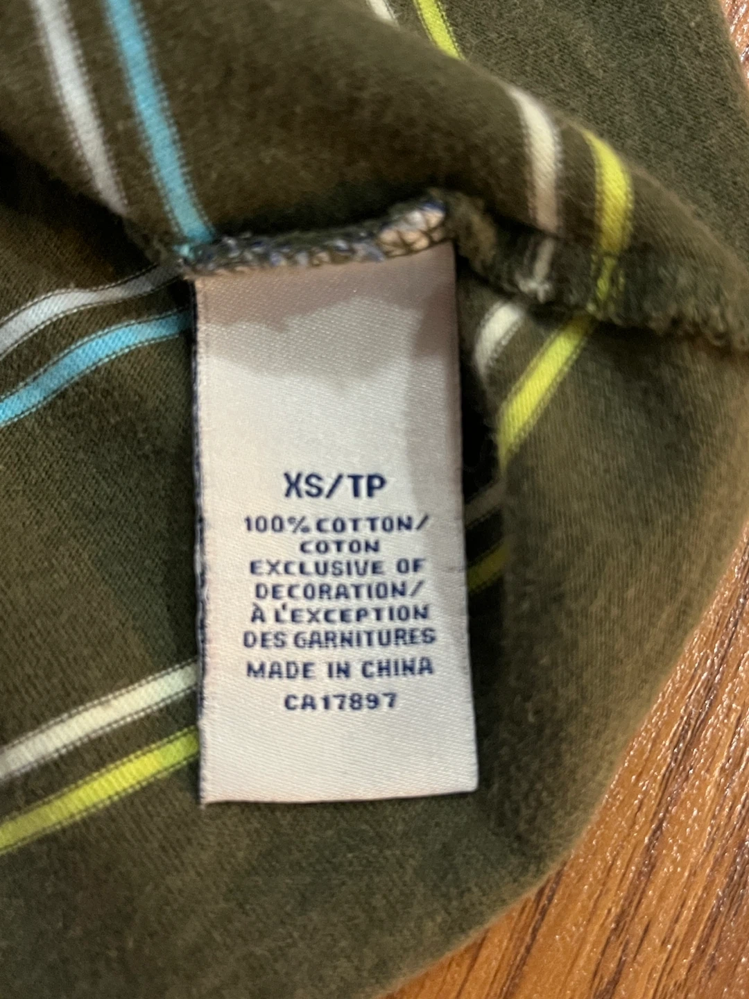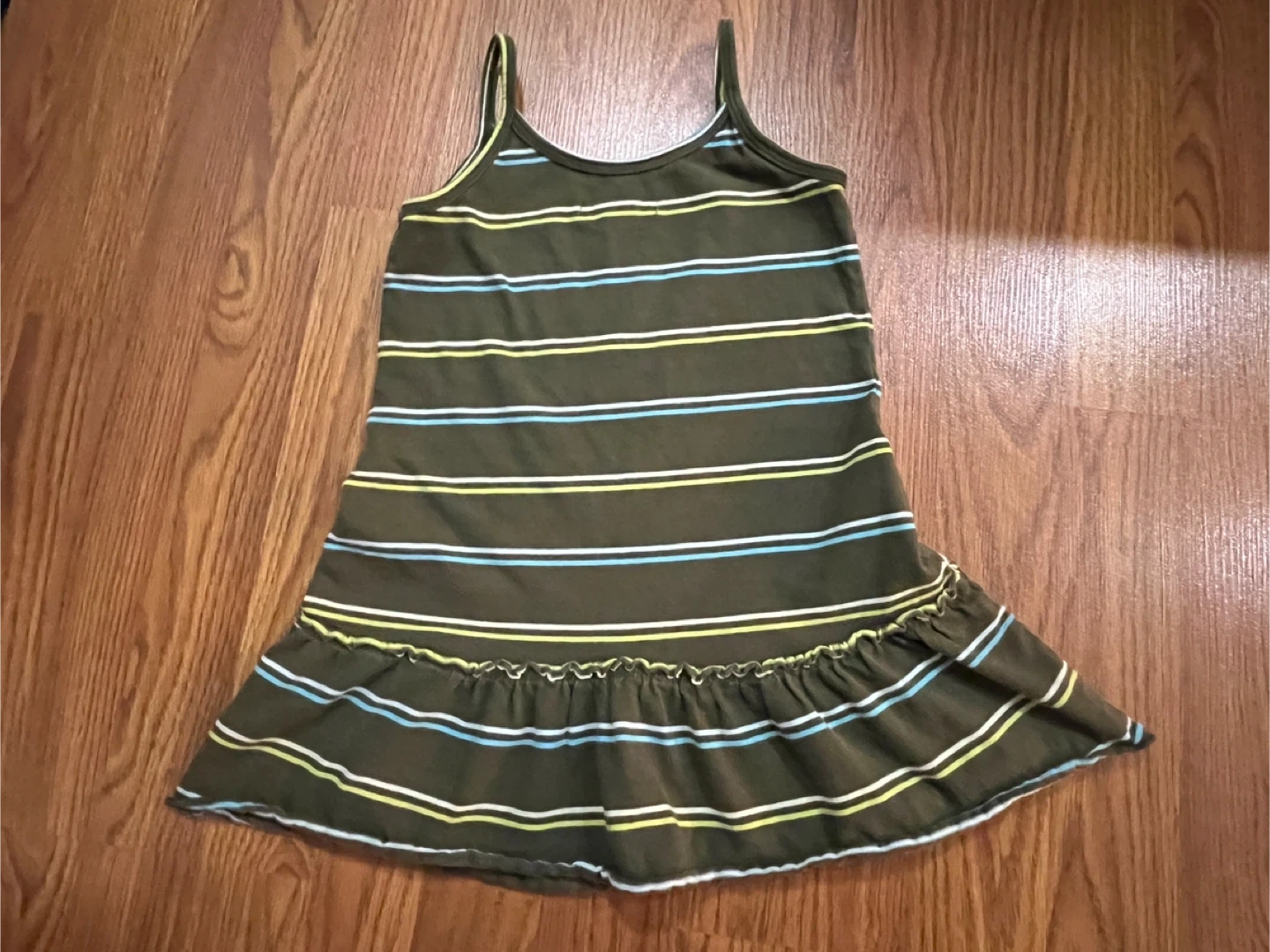 Old Navy girls’ extra small sundress in olive with white teal and yellow stripes. Sleeveless cotton dress with shoulder straps and ruffle hem. Early Y2K era style.