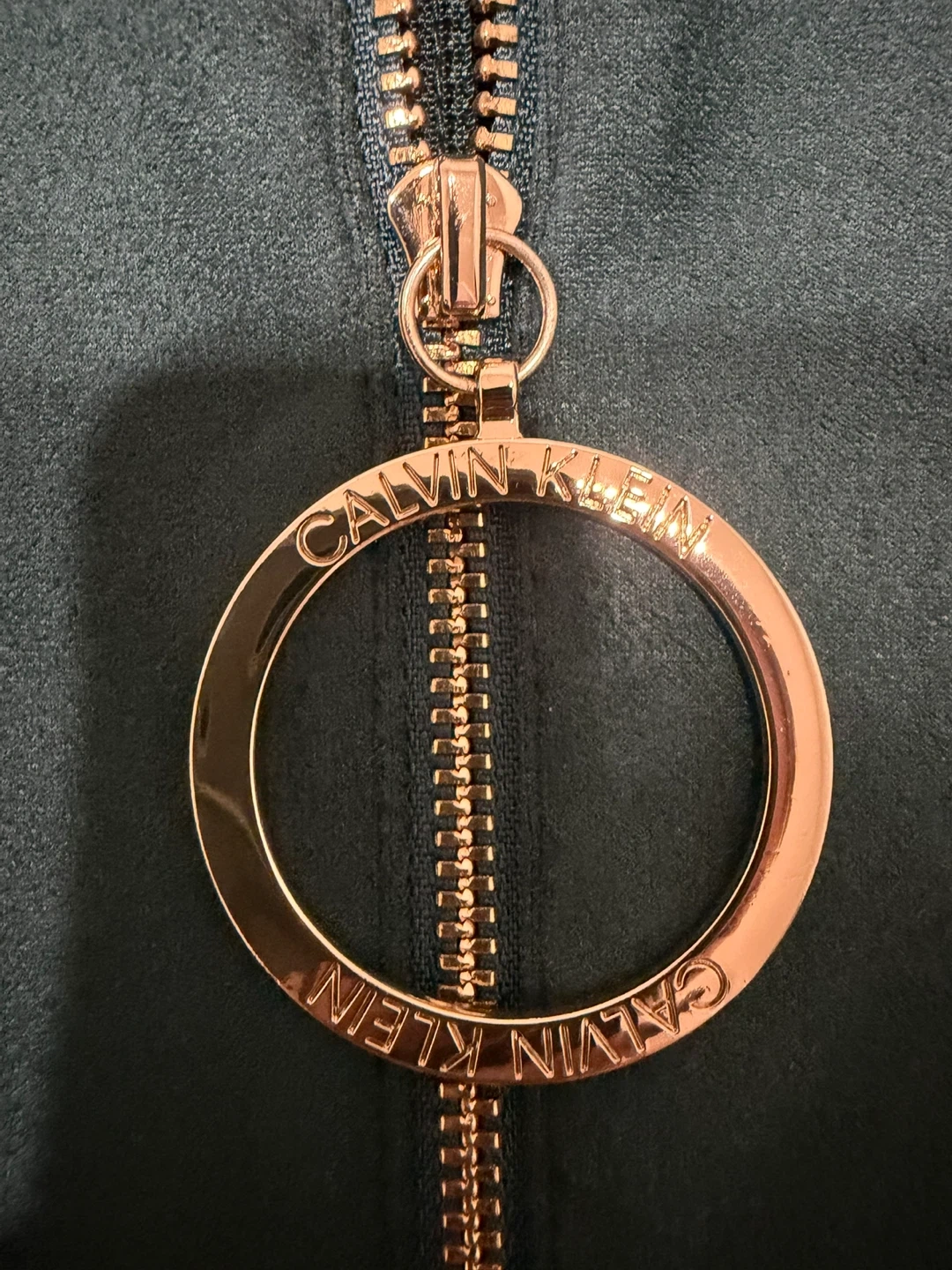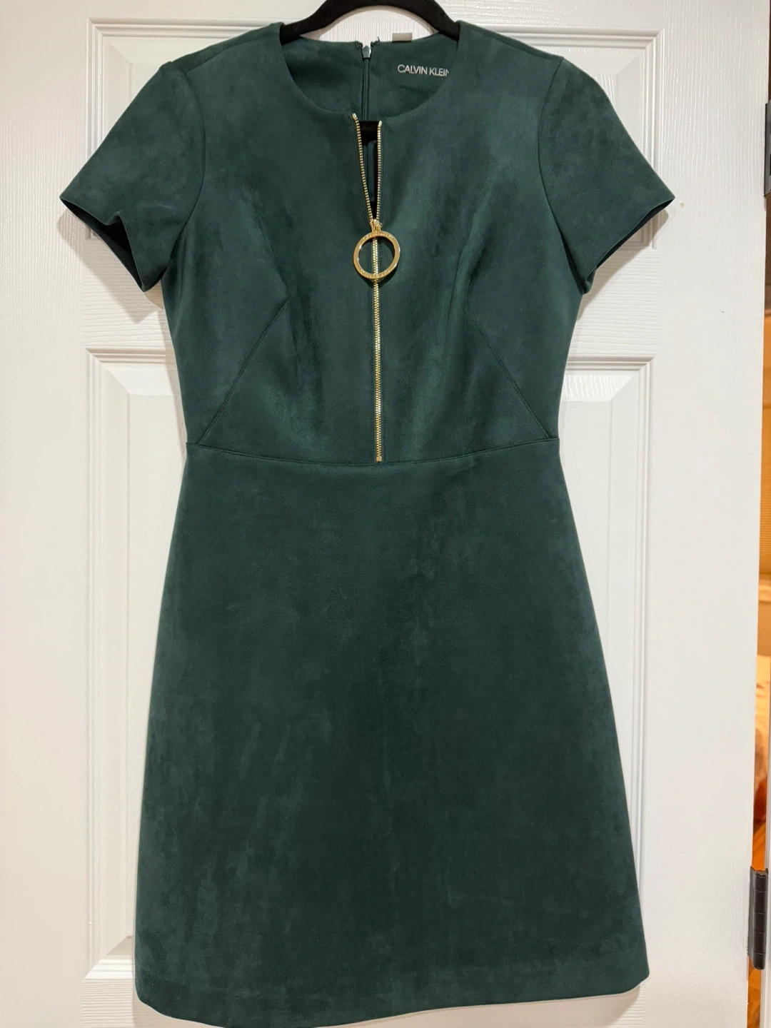 This Calvin Klein dress is made from a soft faux suede material in a deep green color. It features a functional gold zipper with a branded ring pull. Short sleeves and a flattering A-line skirt complete the look.