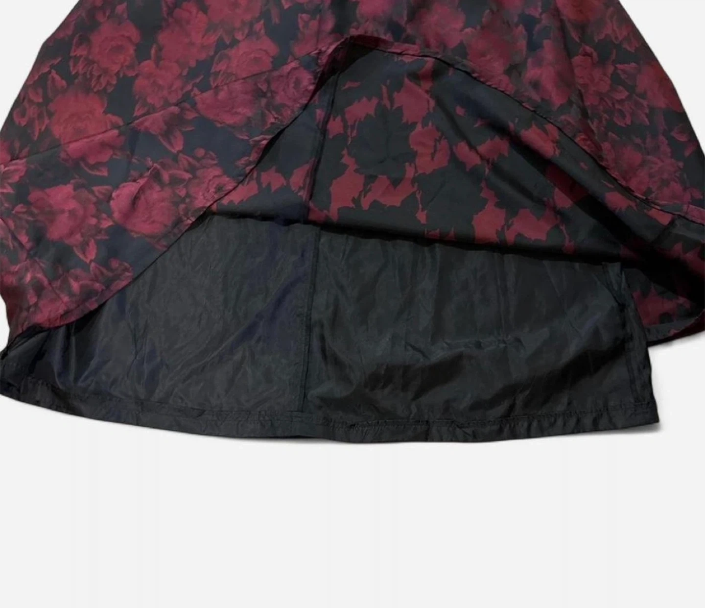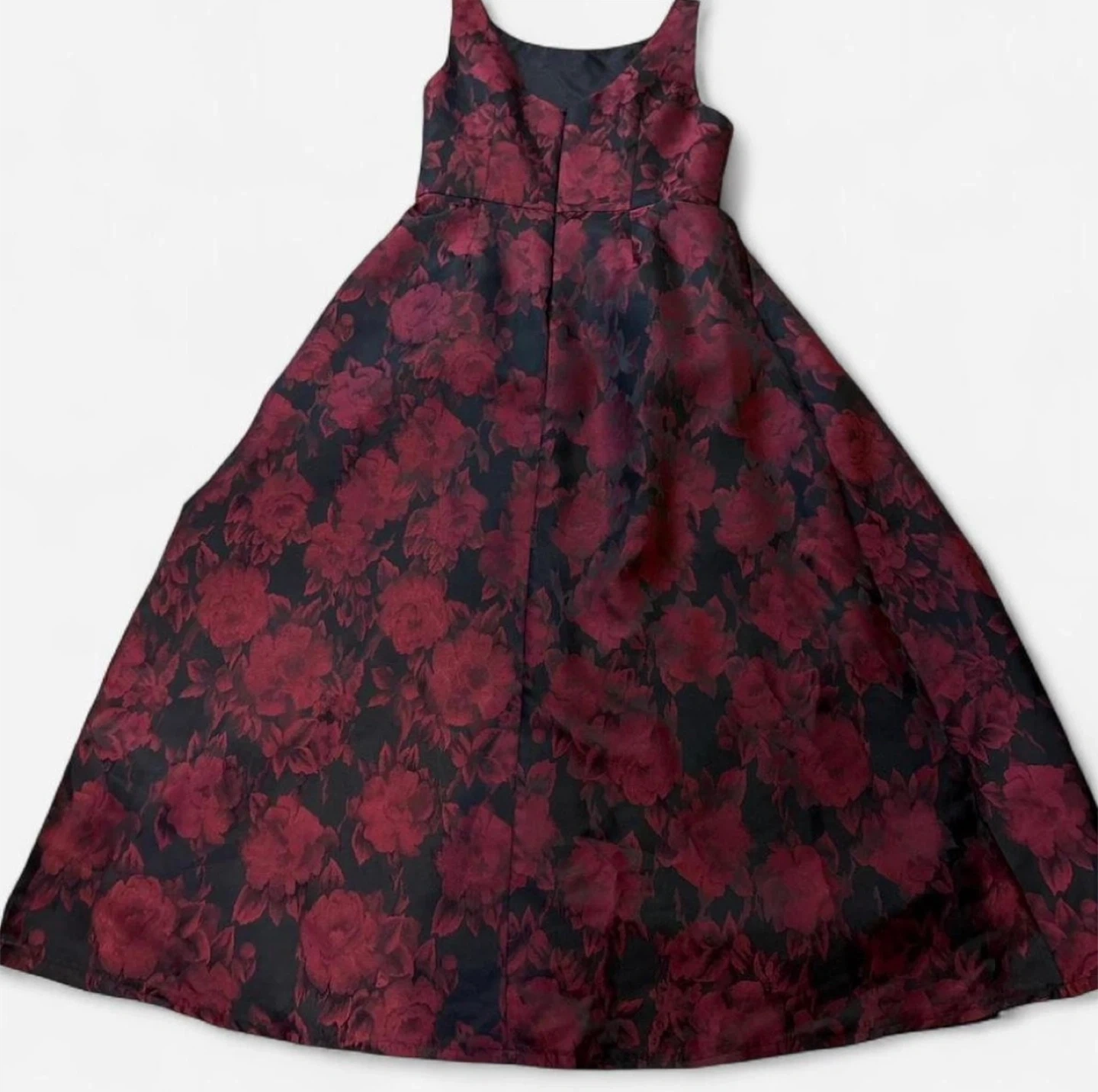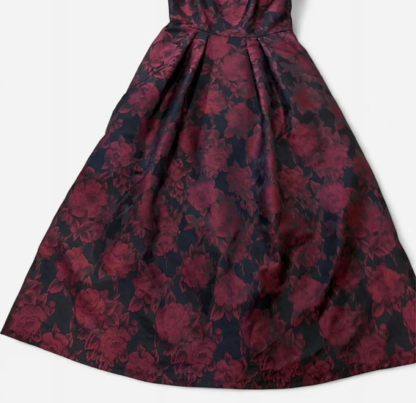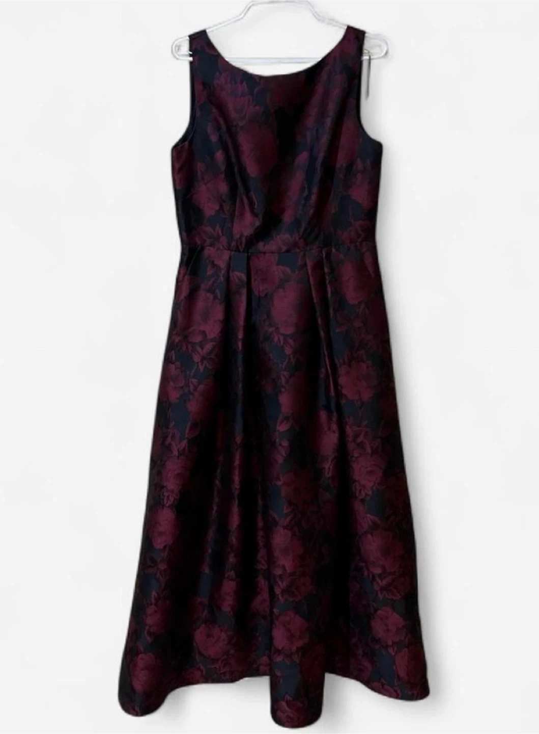 This sleeveless A-line dress features a bold floral print in deep red and black. It has a fitted bodice with a scoop neckline and a flared midi-length skirt. A great option for a dressy event!