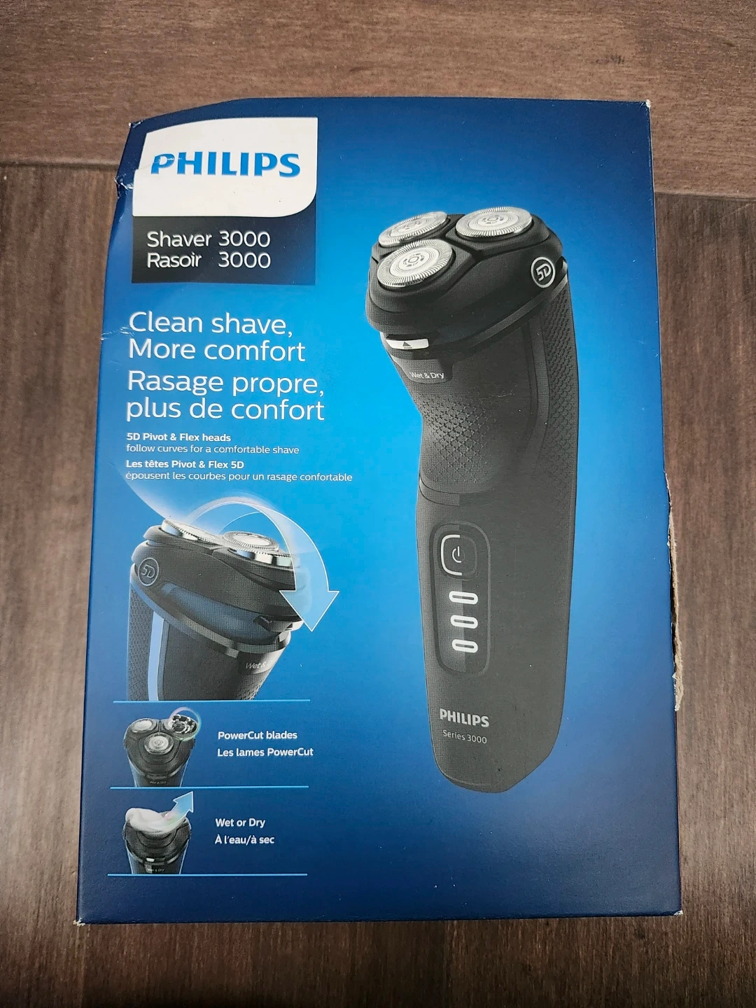 Philips Shaver 3000 Series. Features 5D Pivot & Flex heads for a comfortable shave. PowerCut blades are engineered for a consistent clean shave. Wet or Dry use for a convenient dry or refreshing wet shave.