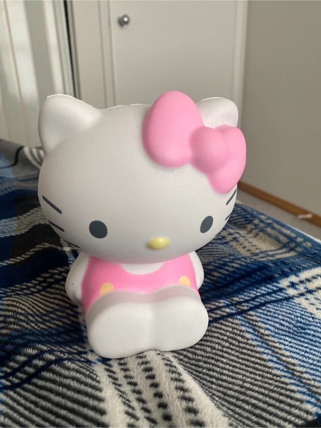 White Hello Kitty squishy toy with a pink bow. Features a pink outfit with yellow dots. Made of soft material, likely foam or rubber. Pick up cash only
