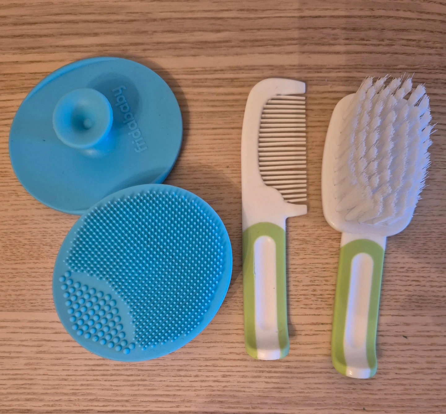 This set includes FridaBaby a blue silicone scalp scrubber. It also comes with a white and green baby comb and a white and green soft bristle brush. Perfect for keeping your little one's hair and skin clean and tidy!
