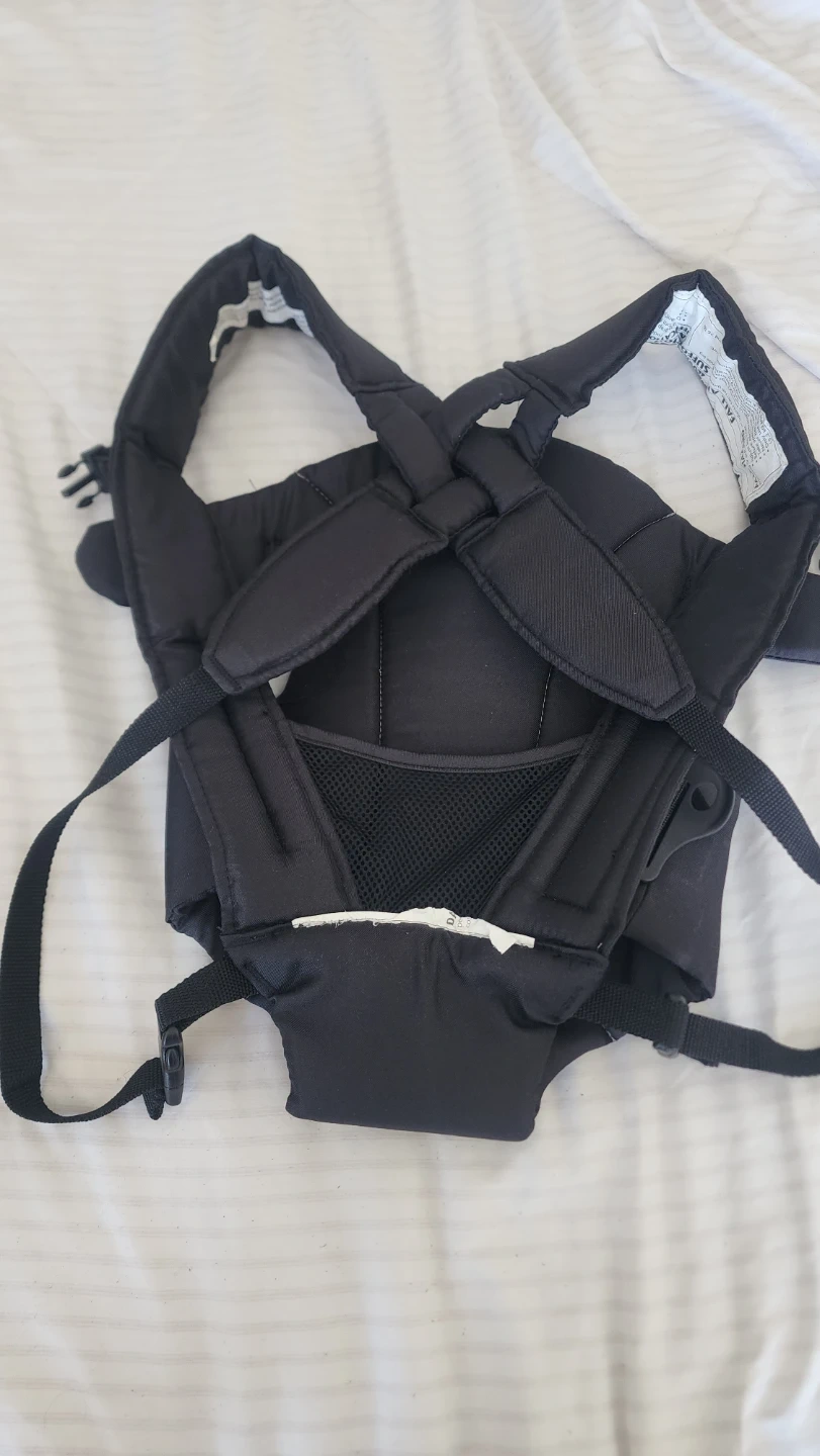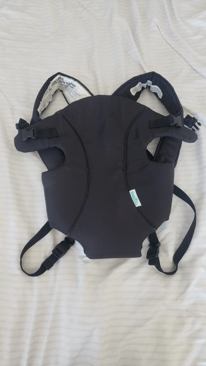 This is a black Evenflo baby carrier. It has padded shoulder straps and adjustable buckles for a secure fit. The carrier is made of durable easy to clean fabric.