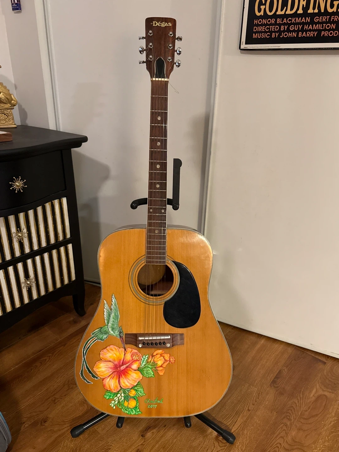 Acoustic guitar from El Degas, featuring custom painted art of a hummingbird and hibiscus flowers. The year '2017' is signed by the artist. It has a natural wood finish and standard tuning pegs.
