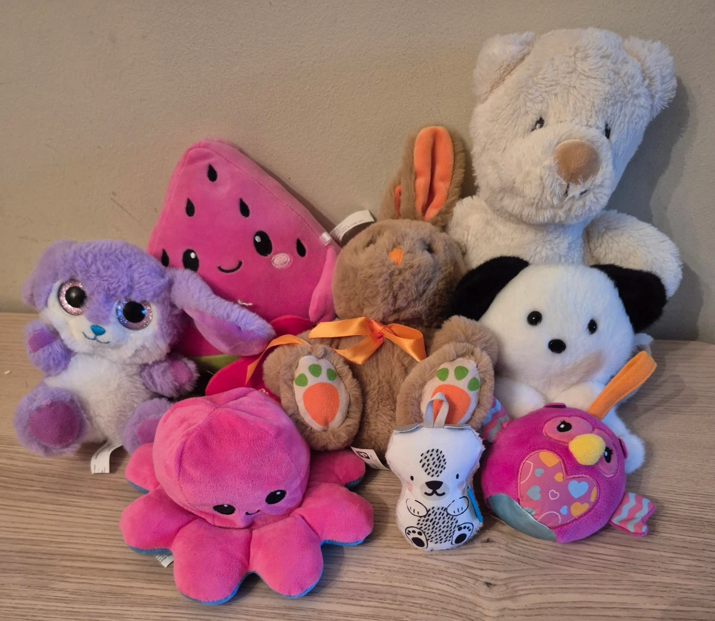A collection of various stuffed animals including a watermelon, a teddy bear, bunnies, a dog, and an octopus. Made of soft plush material for cuddles. Perfect for kids' playtime or room decor!