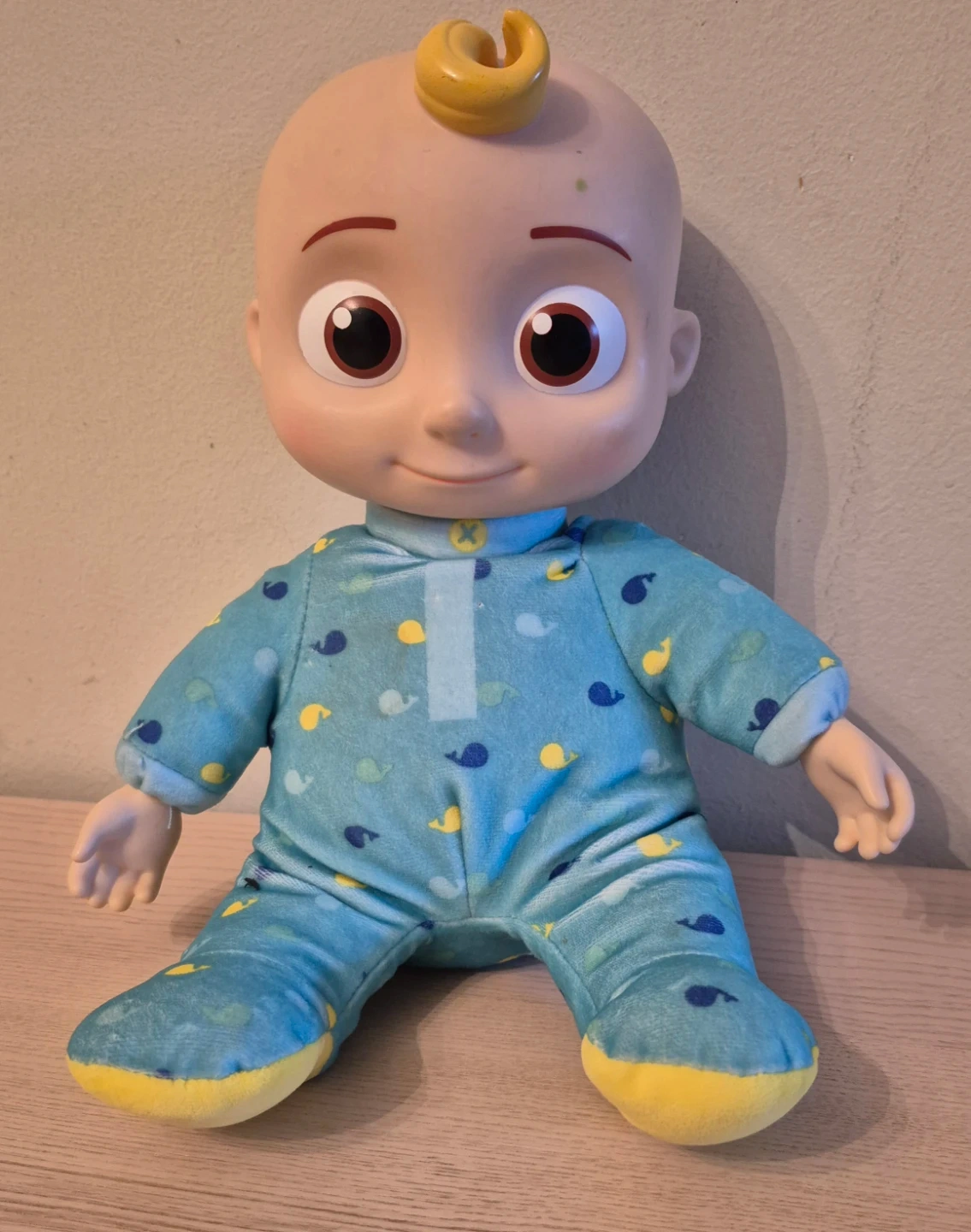 This Cocomelon JJ doll is ready for bedtime fun. It's wearing blue pyjamas with whale and cloud patterns. The doll has a soft body and a plastic head. Pressing the belly will make the doll sing or say a variety of phrases.