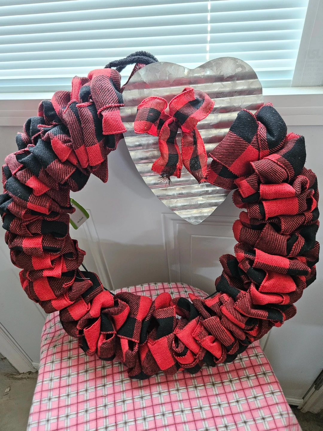 A festive buffalo plaid wreath featuring ruffled fabric in red and black. It has a galvanized metal heart with a red ribbon bow attached. This charming wreath is perfect for adding a rustic touch to your home decor.