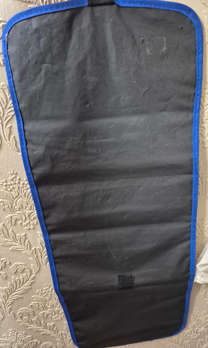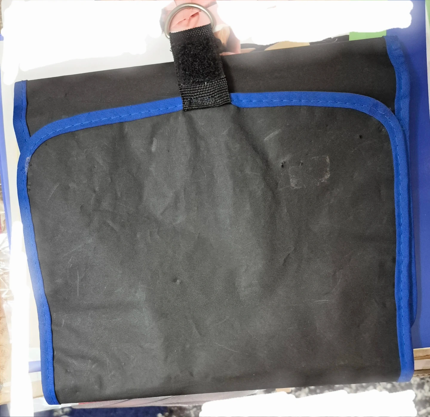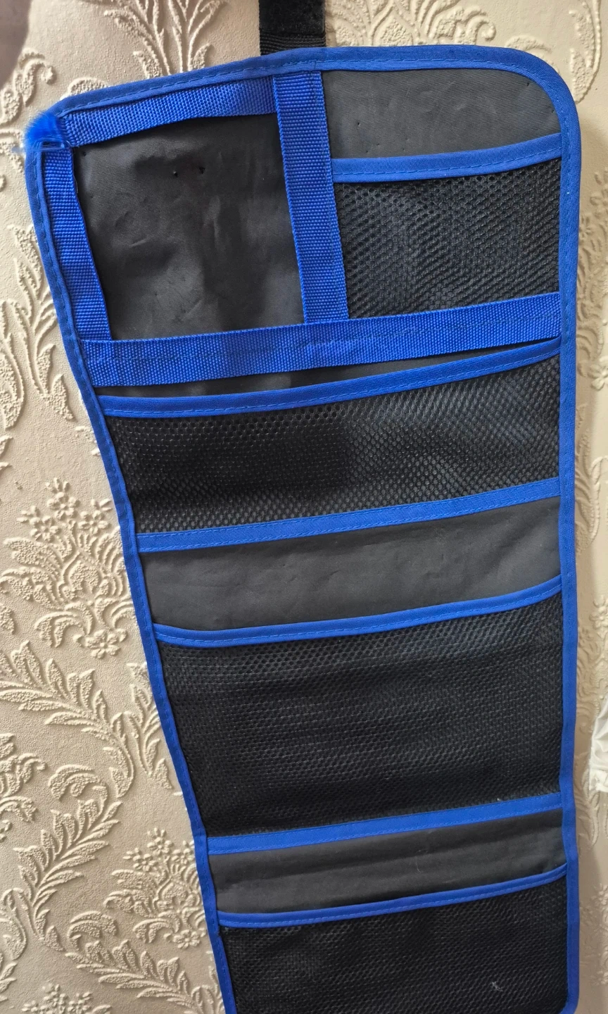 This hanging organizer is black with blue trim and features multiple pockets for storage. It's made of fabric and has a metal ring for hanging. Great for organizing small items!