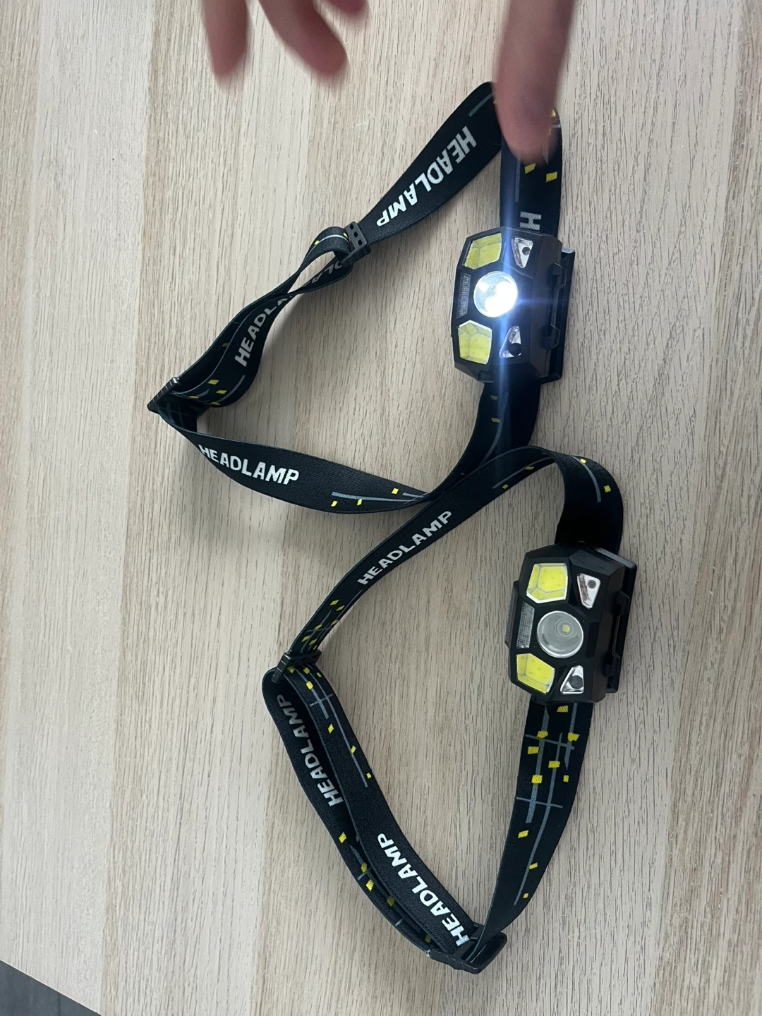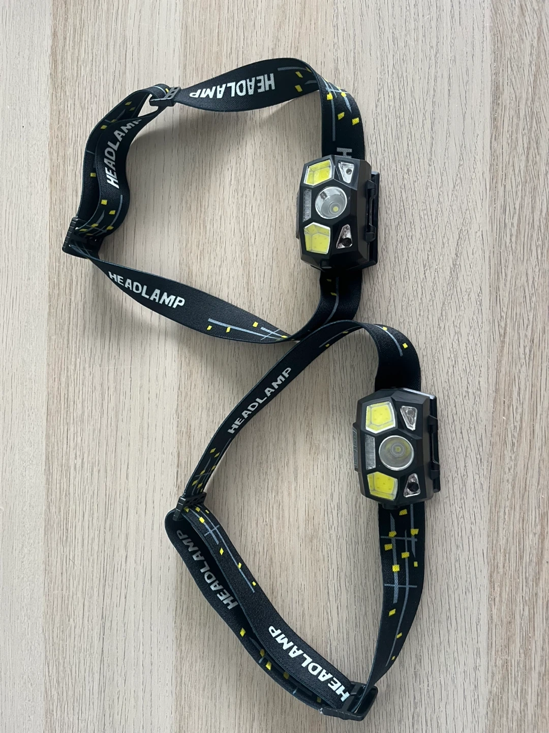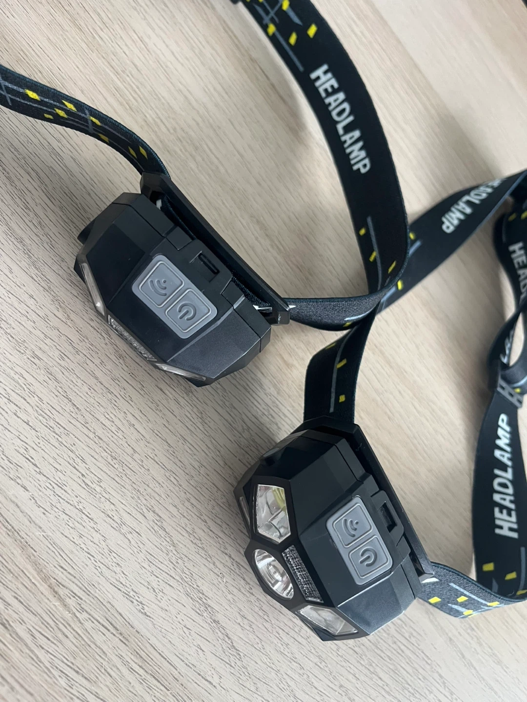 Selling two black headlamps as a set. They feature adjustable elastic straps. Each unit has multiple LED lights and a power button.