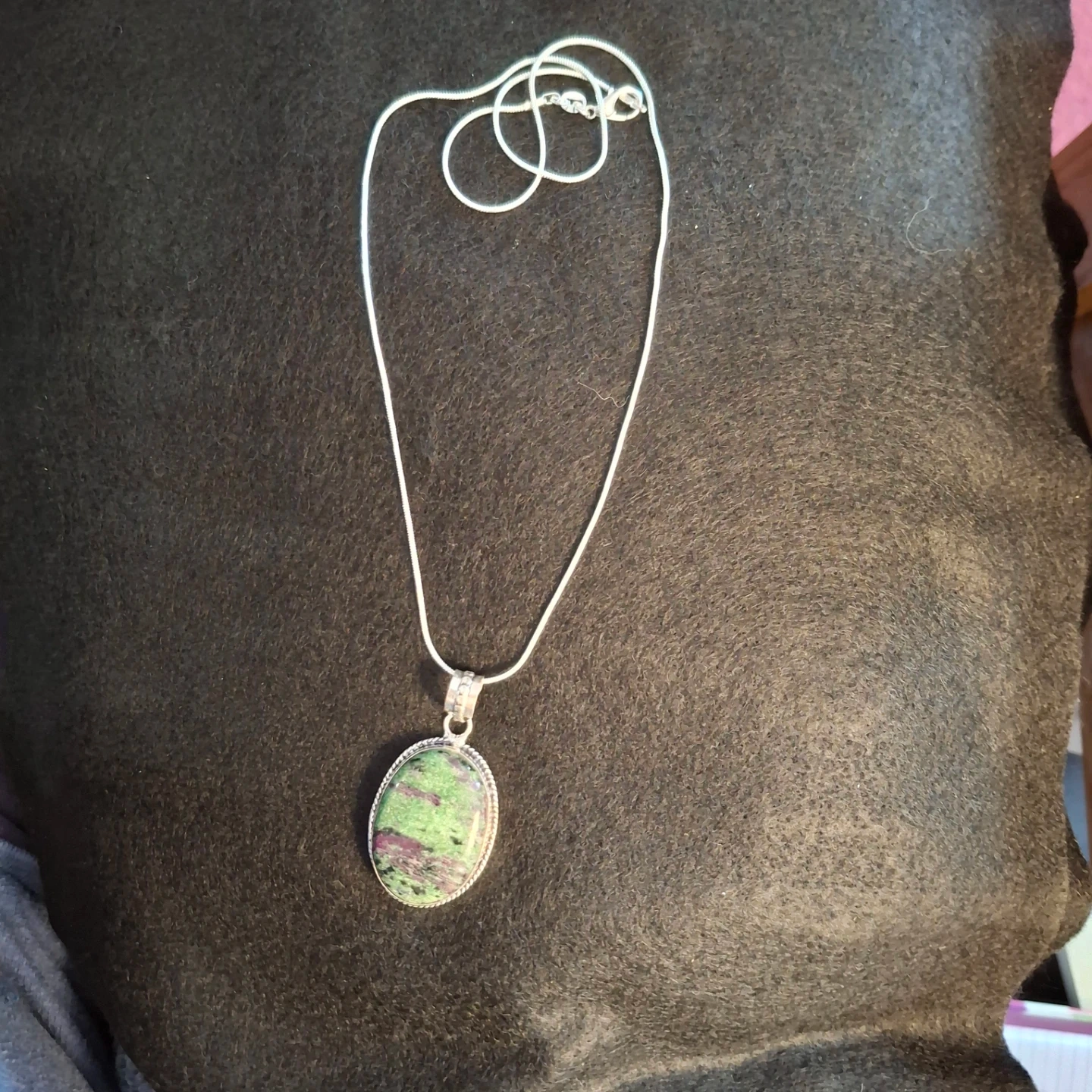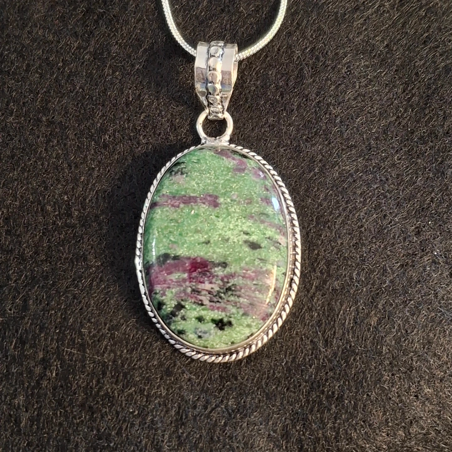 A lovely sterling silver pendant necklace featuring a natural oval ruby zoisite stone. The bail has a textured design. This unique piece adds a touch of natural beauty to any outfit. It's perfect for someone who appreciates unique gemstone jewellery.