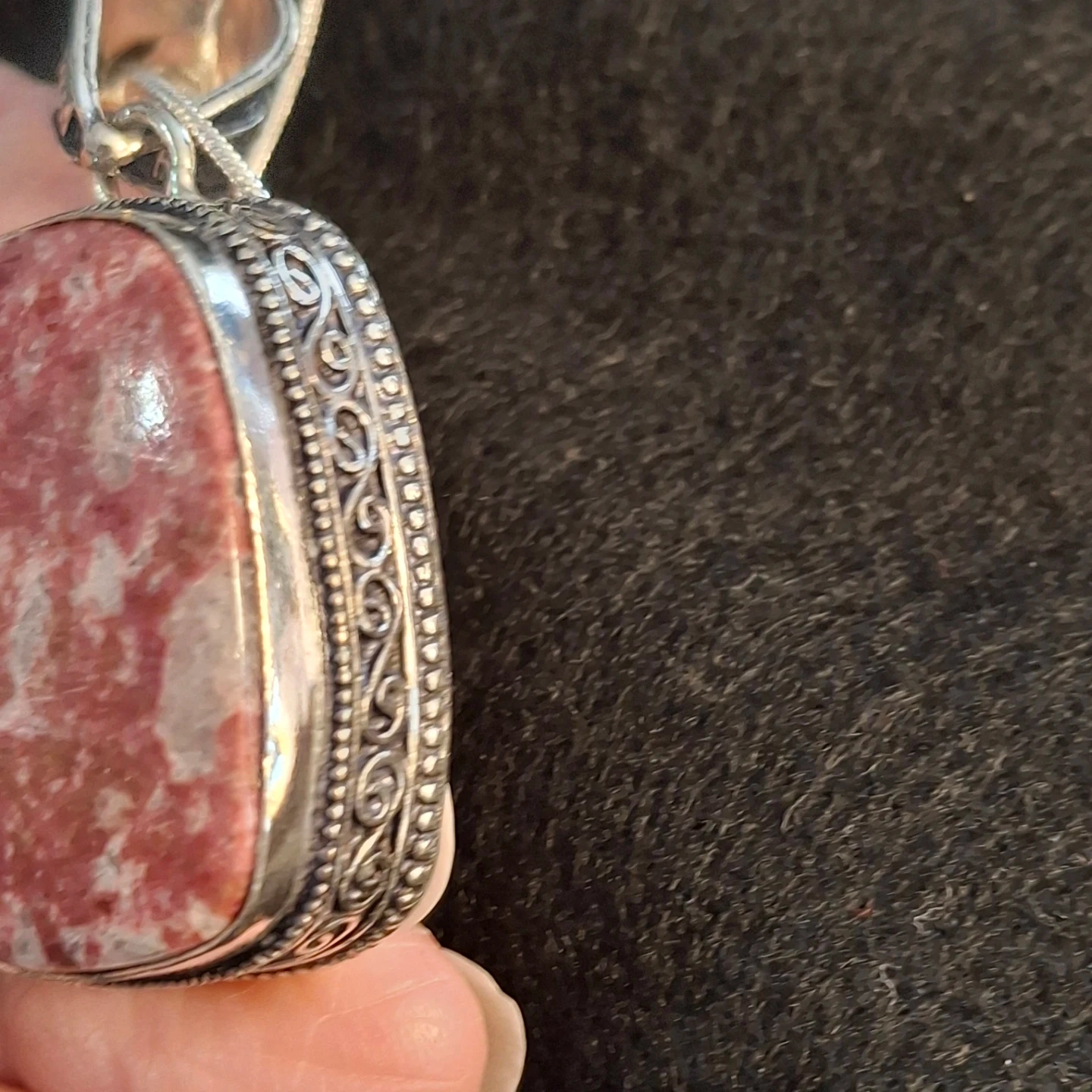 A pendant featuring a polished rhodochrosite, set in a detailed silver frame. It hangs on a sterling silver chain. This piece adds a touch of natural colour to any outfit.