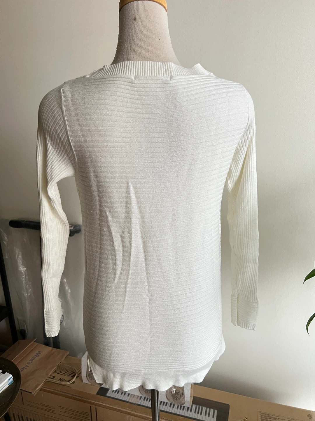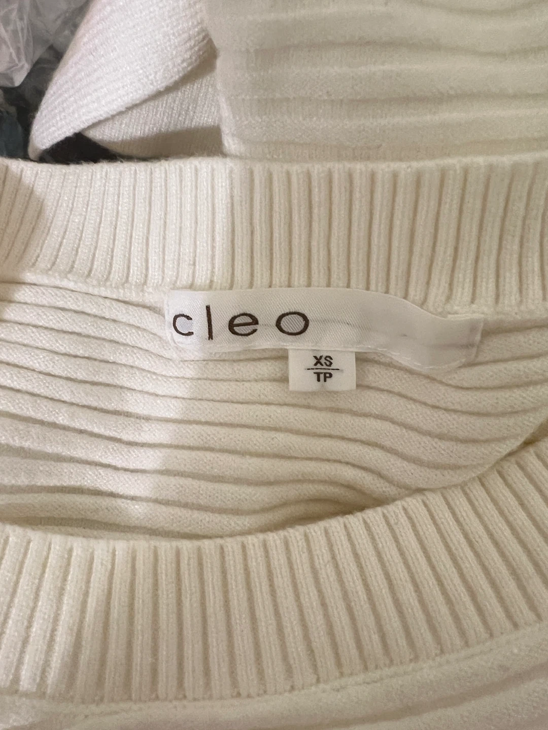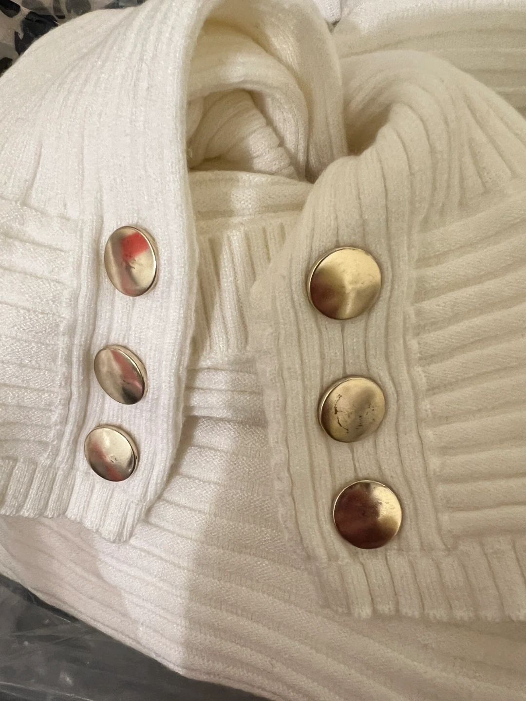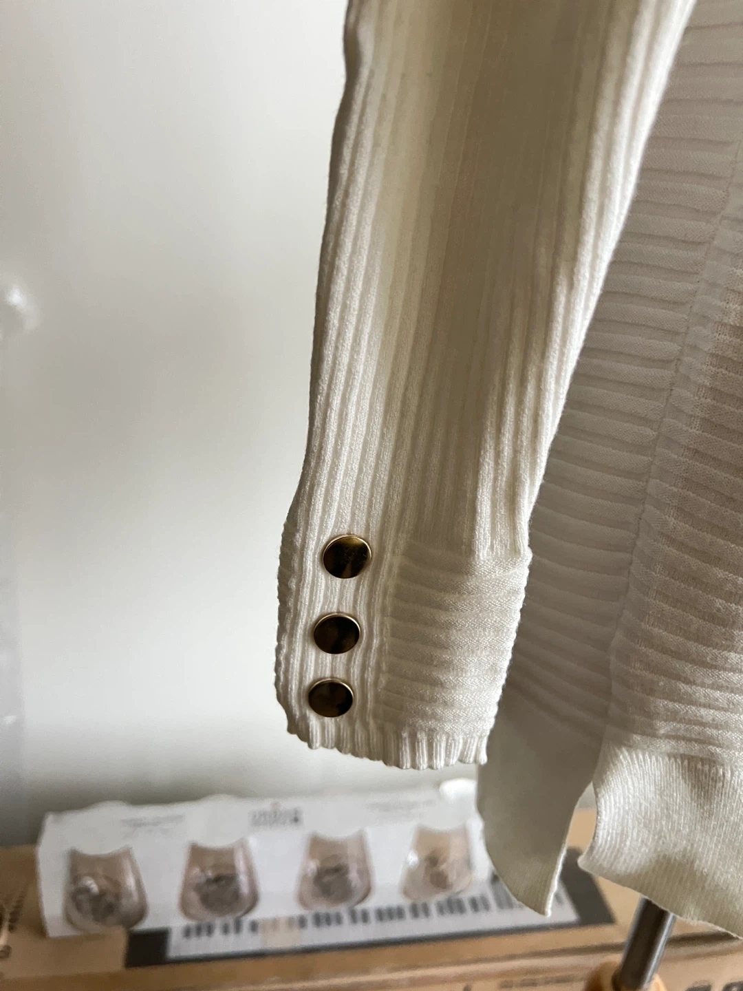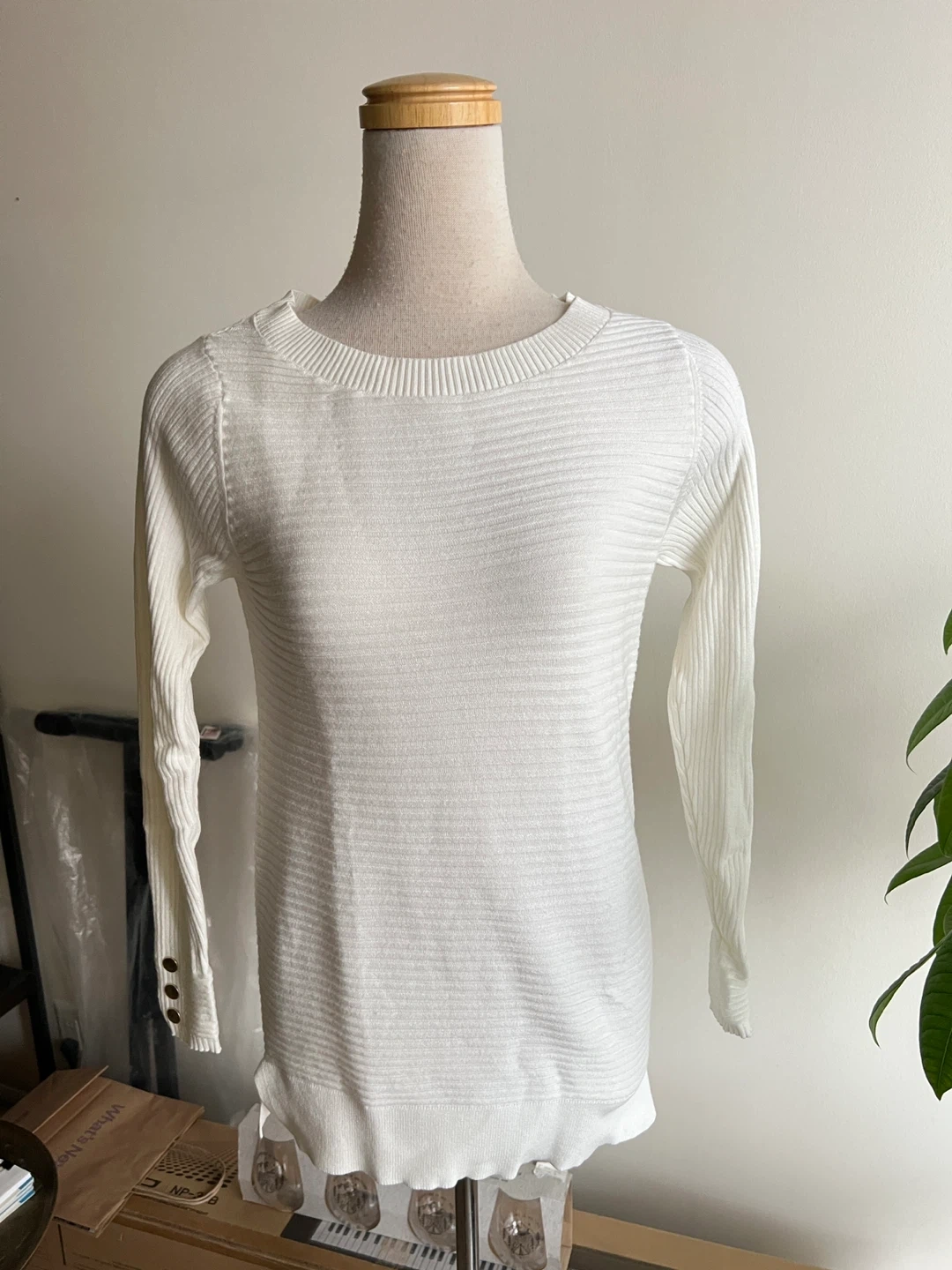 This is a white ribbed knit long sweater from Cleo. It features gold buttons on the cuffs. Size XS. Worn twice. Excellent condition.