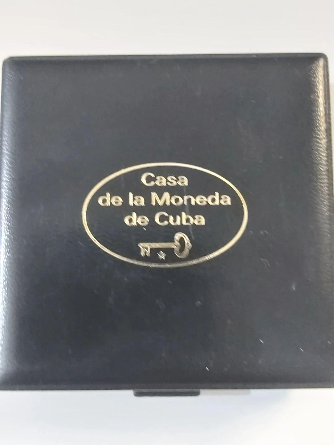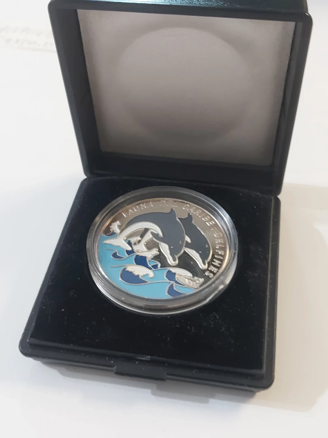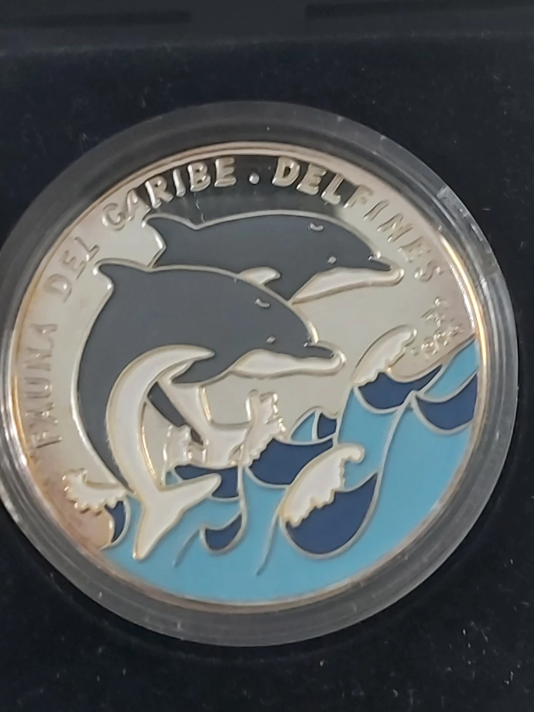 This is a commemorative Silver Coin from the Casa de la Moneda de Cuba featuring dolphins. It's part of the 'Fauna del Caribe' series. Comes in a protective case.