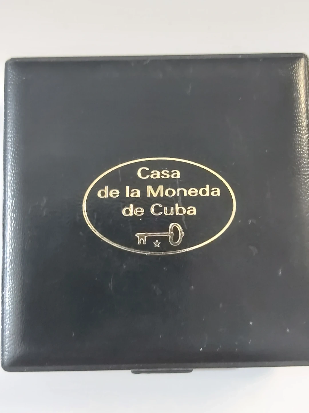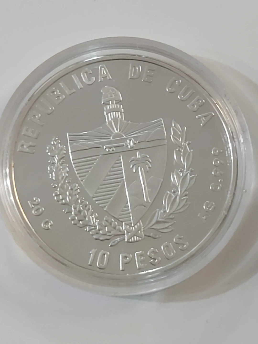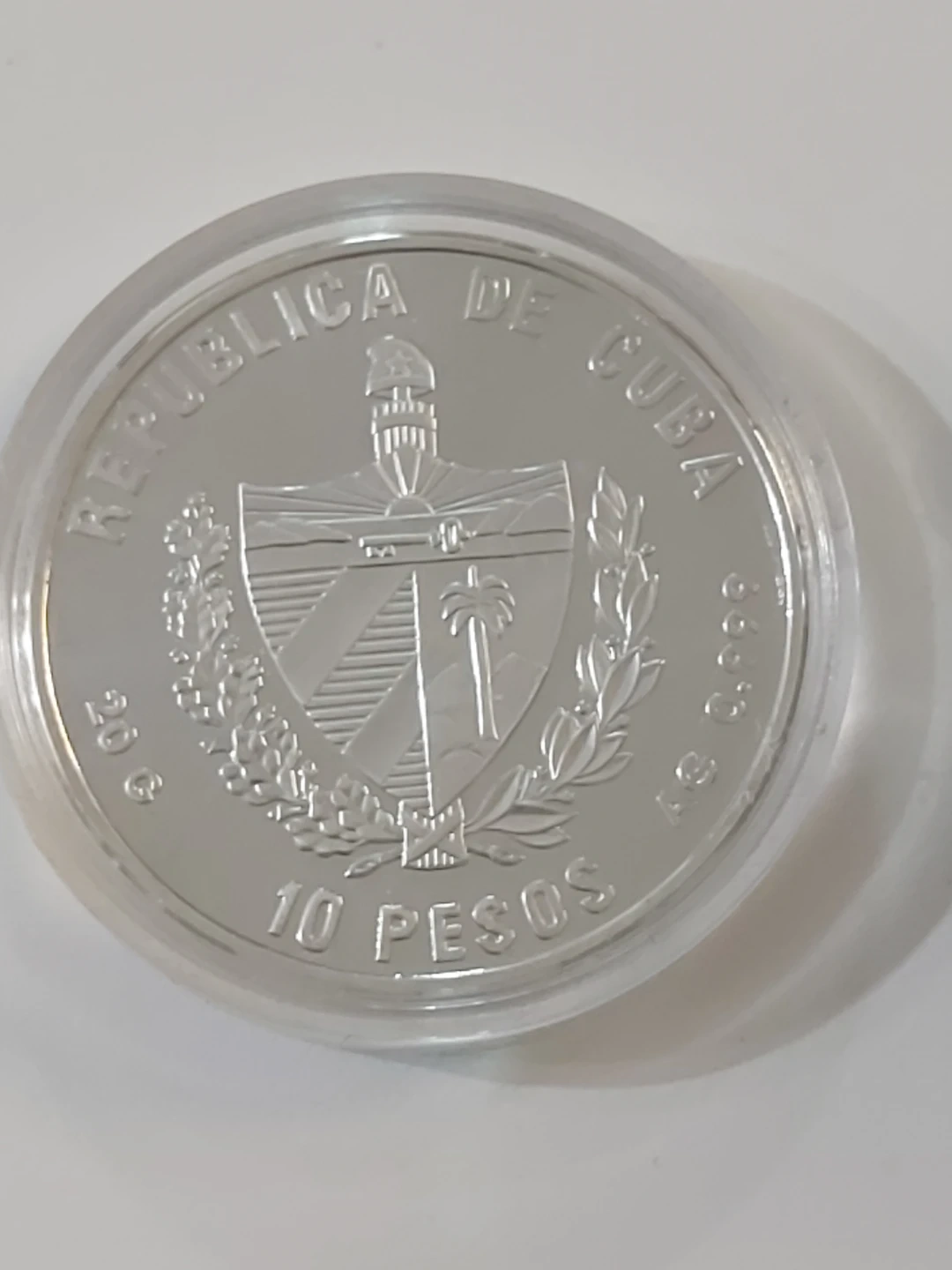 This is a commemorative Silver Coin from the Casa de la Moneda de Cuba featuring dolphins. It's part of the 'Fauna del Caribe' series. Comes in a protective case.