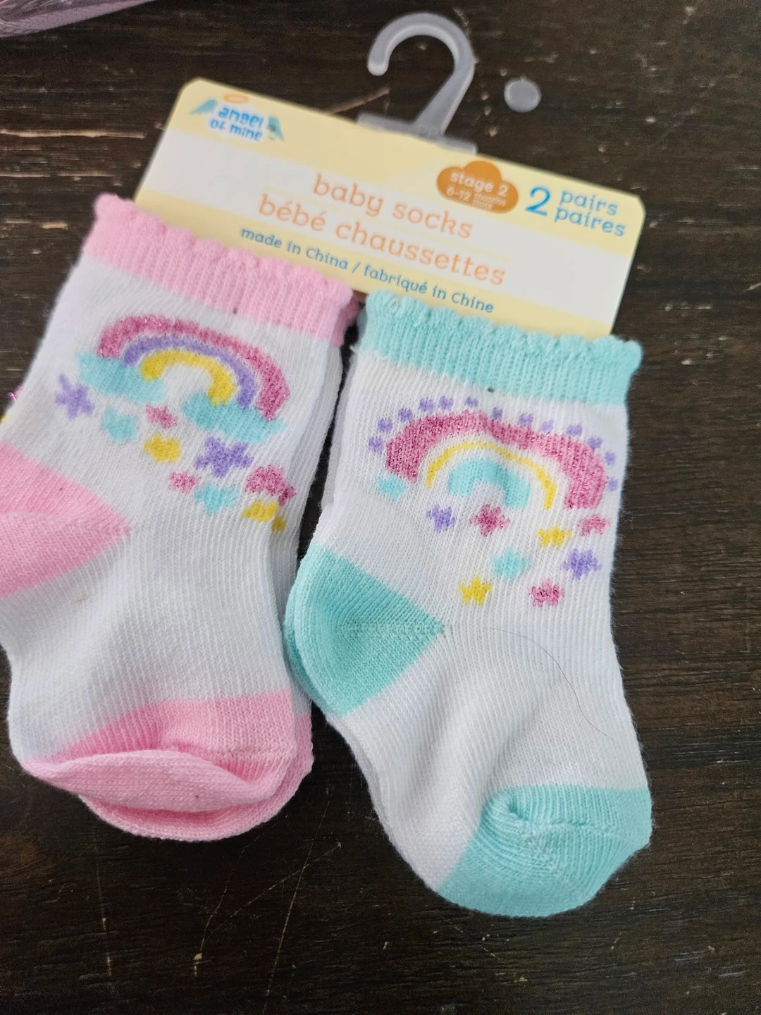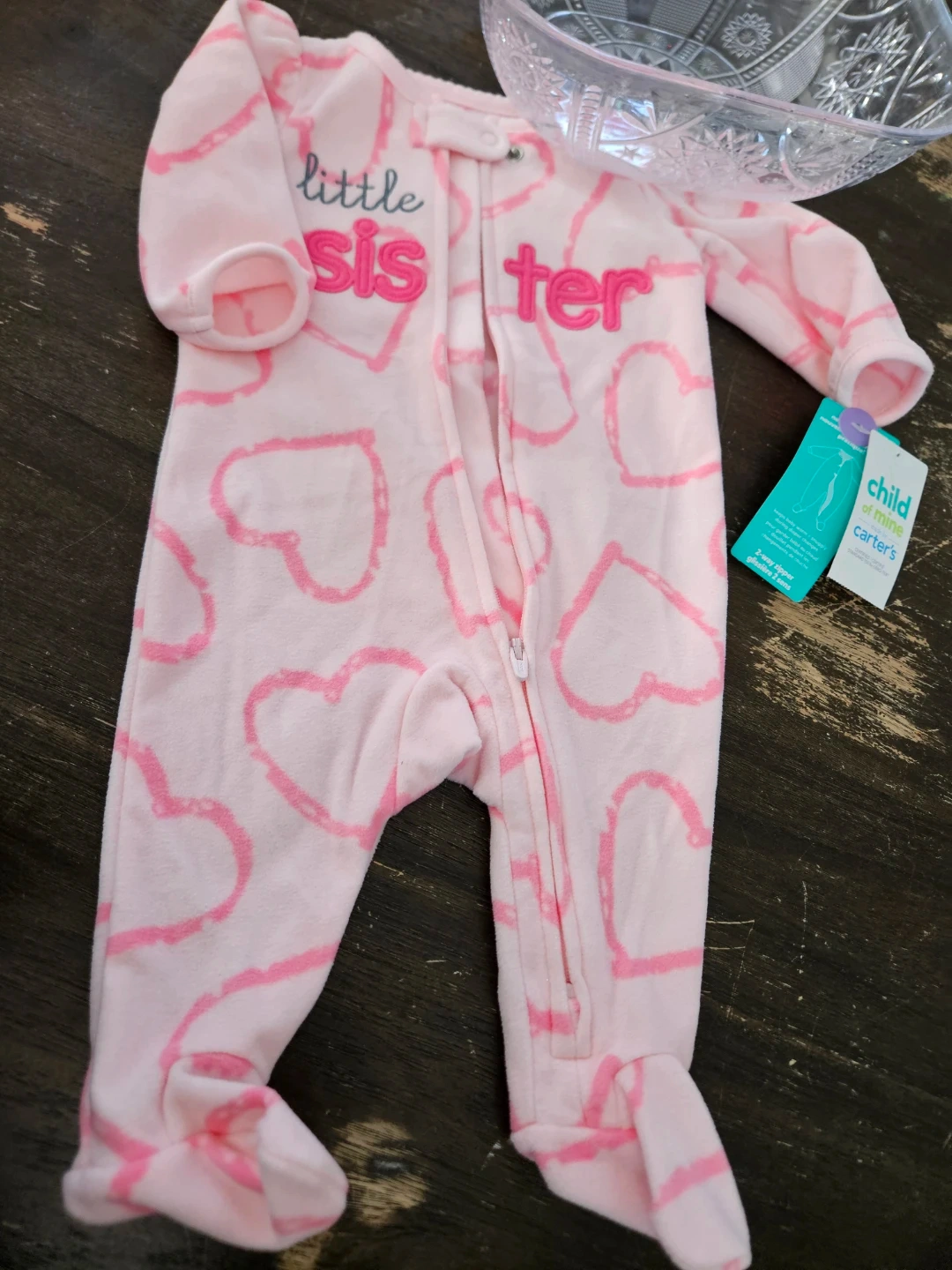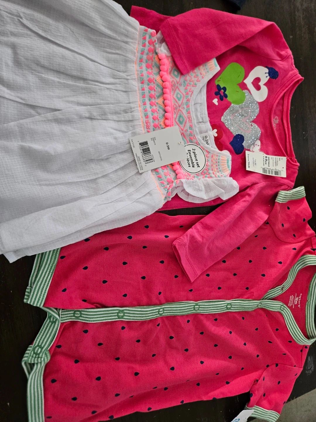 This adorable bundle includes a Carter's baby girl onesie with a cute watermelon design, a sleeper "little sister". It also comes with two pairs of "angel dear" baby socks, one featuring rainbows and clouds. Perfect for a newborn or infant. Sizes are 0-3M for the onesie and Stage 2 (6-12 months) for the socks. Also a long sleeve hearts top, and a short sleeve dress. Contains 1 plastic tote, hello 😺 kitty theme.