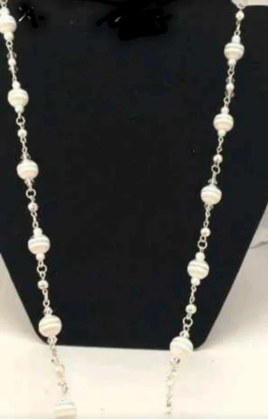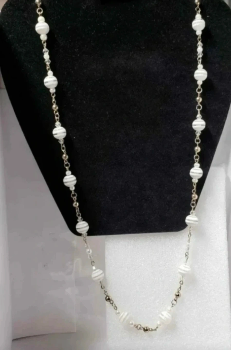 This necklace features a delicate silver-tone chain interspersed with white beads and subtle striped detailing. Small, clear beads add a touch of sparkle. It's a lovely accessory for adding a bit of shine to any outfit.