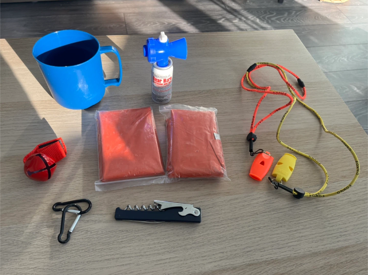 This kit includes a Frontiersman Bear Horn for loud signalling, a bear bell, and two Fox 40 micro safety whistles. Also included is a blue plastic mug, a multi-tool and two emergency foil blankets. A great set for outdoor adventures!