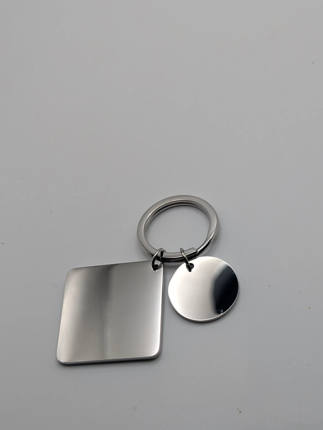 Blank metal keychain set featuring a square and a round tag. Both tags are made of stainless steel, ready for your custom engraving. Comes with a sturdy keyring to hold your keys securely.