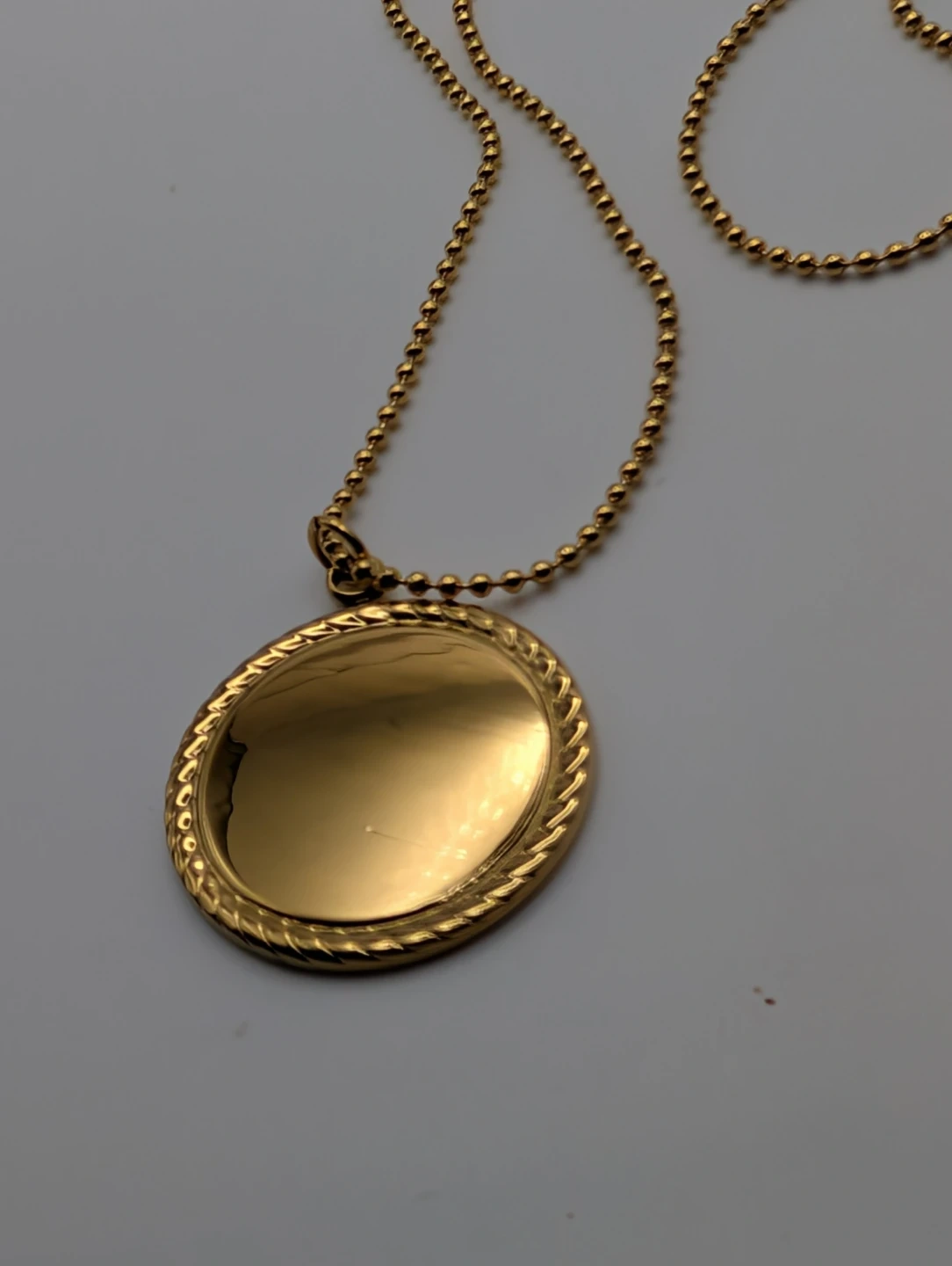 This gold tone oval locket necklace features a rope-style border. It hangs from a beaded ball chain. It's a classic piece for storing small photos or mementos.