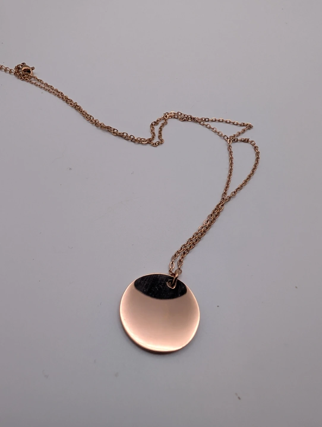 A rose gold tone necklace featuring a circular disc pendant. It's a simple and classic piece that's great for everyday wear. The chain has a standard clasp closure.