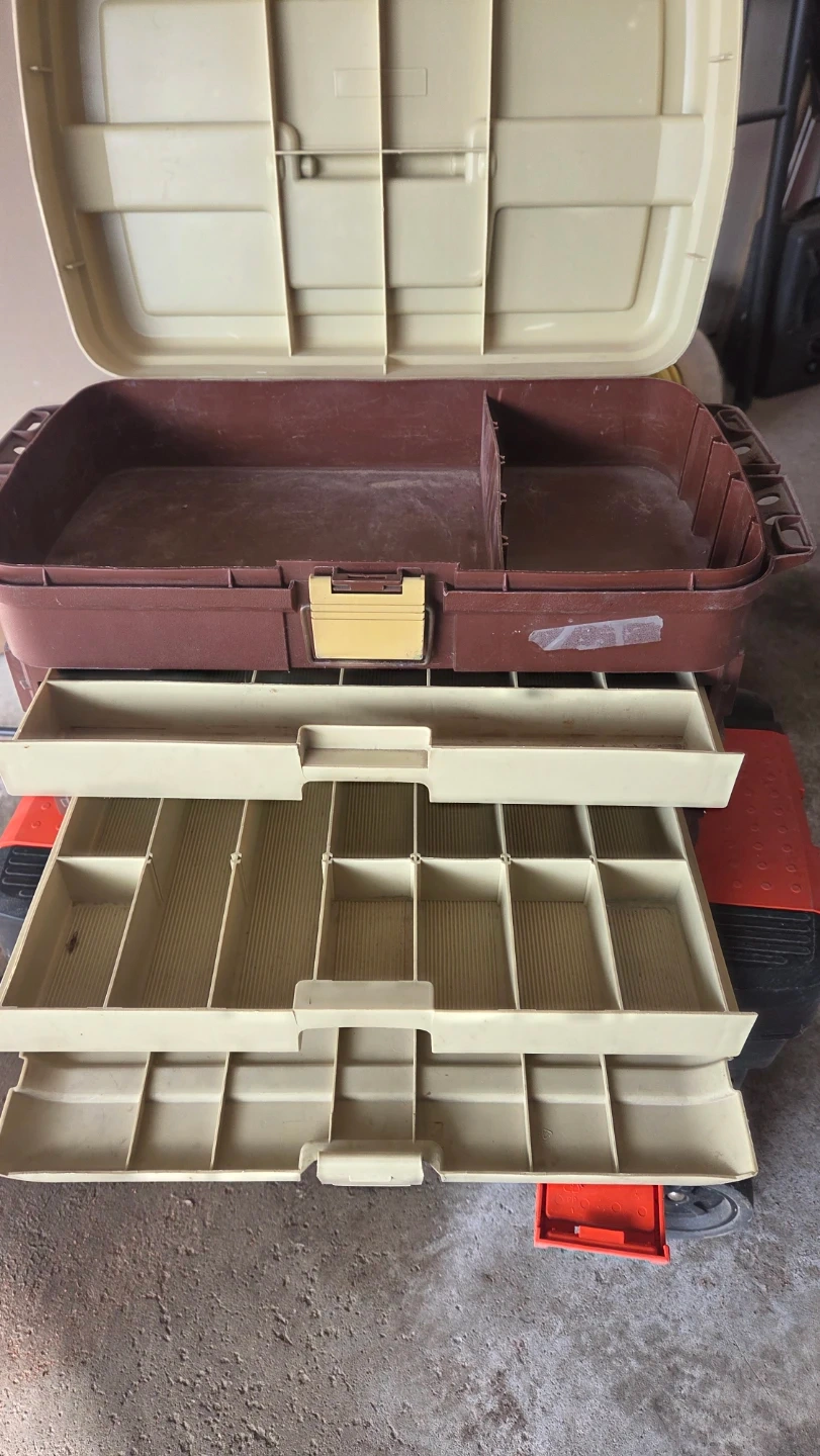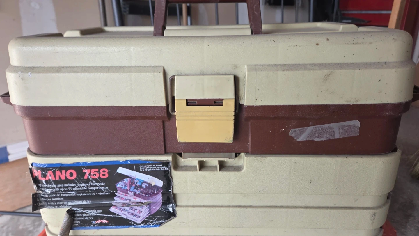 This is a Plano 758 tackle box with multiple compartments. It features a top-access storage area and two pull-out drawers with adjustable dividers. It's made of plastic.