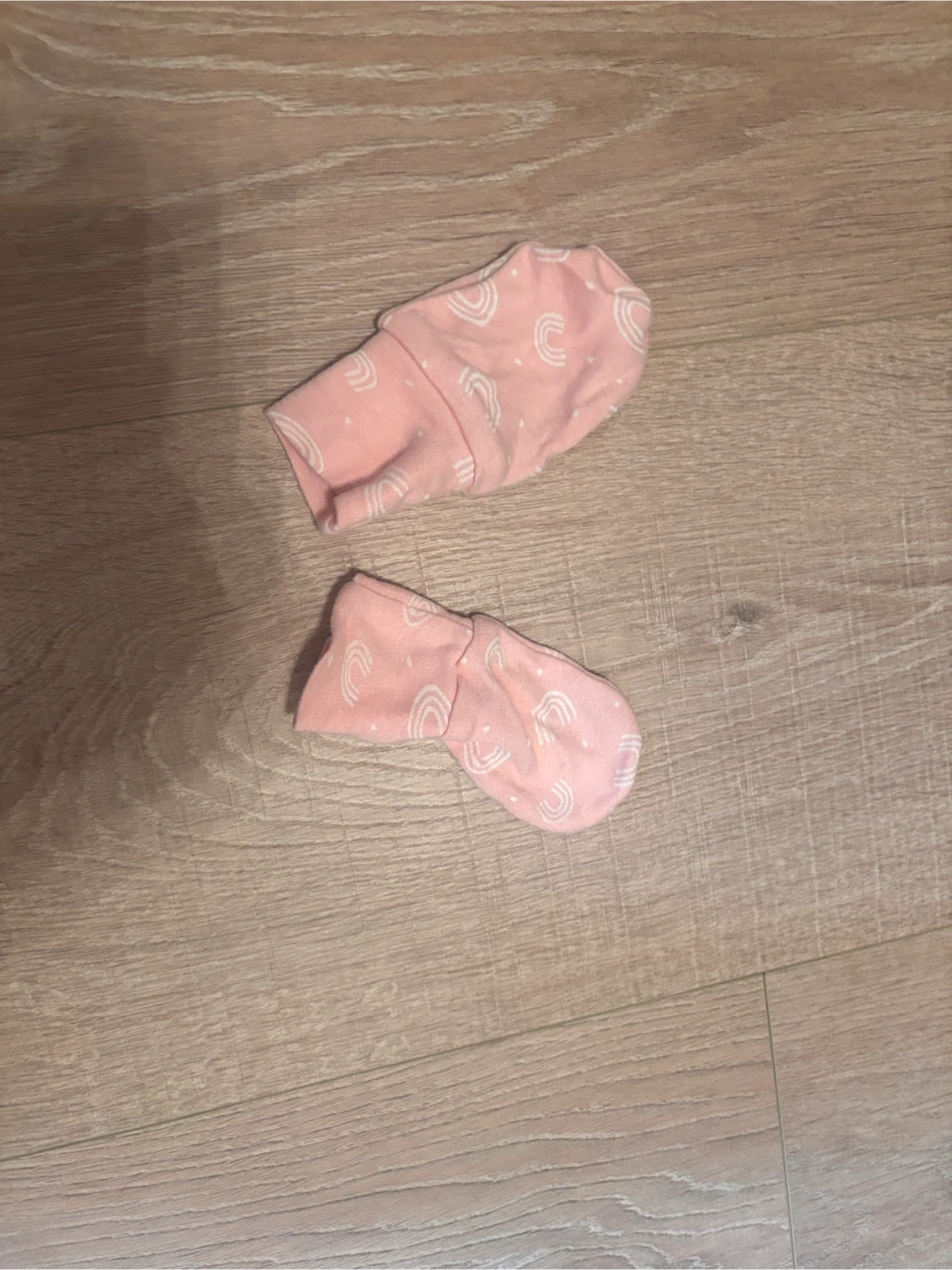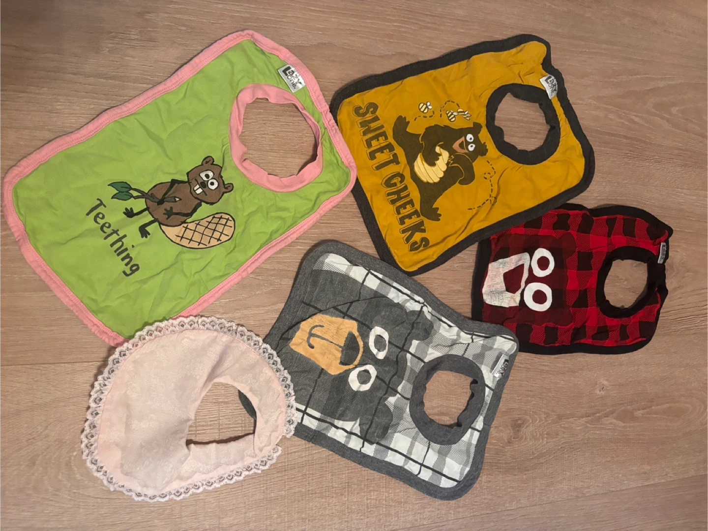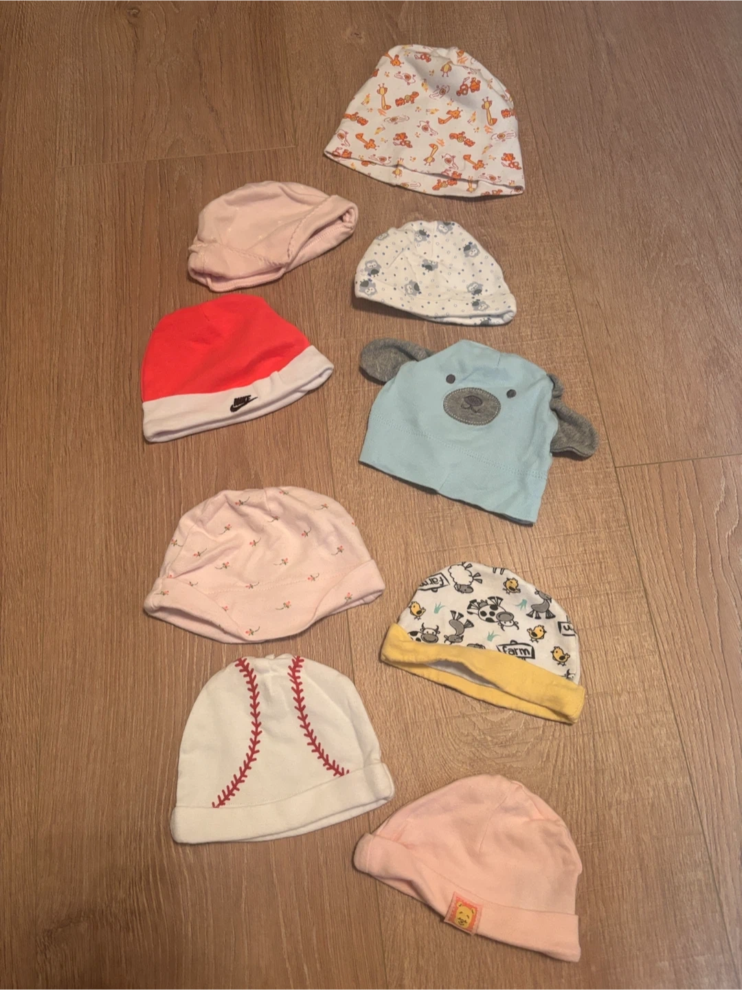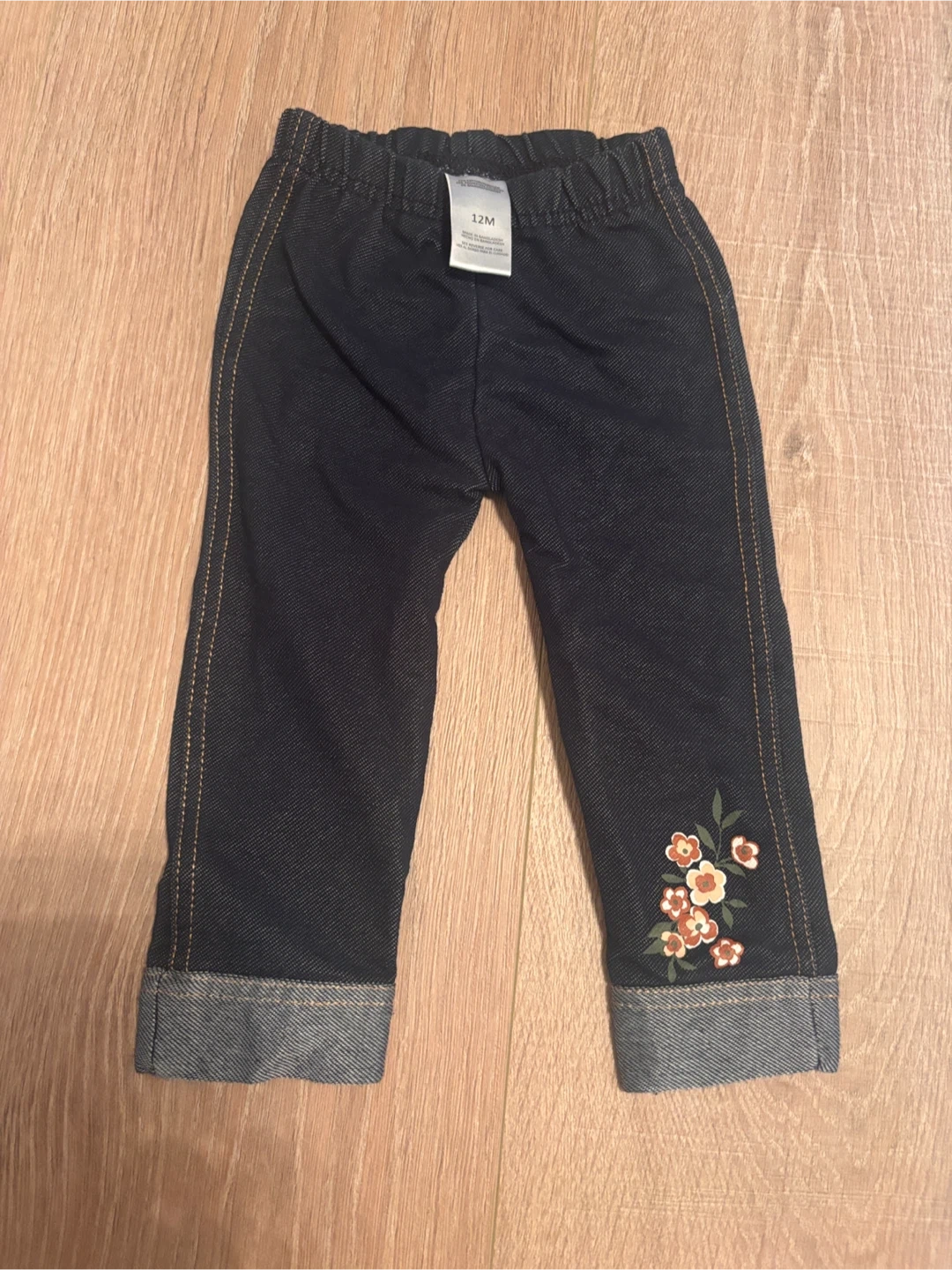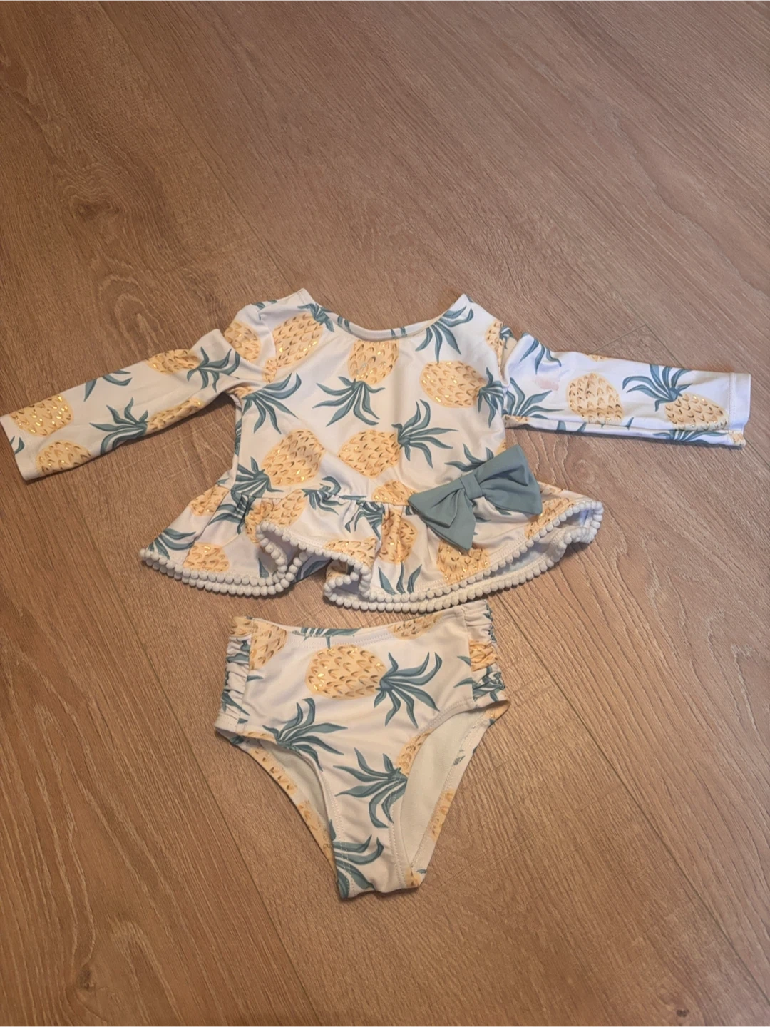 This bundle includes a pineapple print swimsuit(12 months), denim pants with floral print, and various assorted baby hats and bibs as well as a pair of mits. The denim pants are size 12 months. It's perfect for dressing your little one in cute outfits!