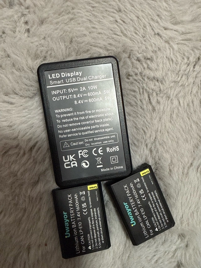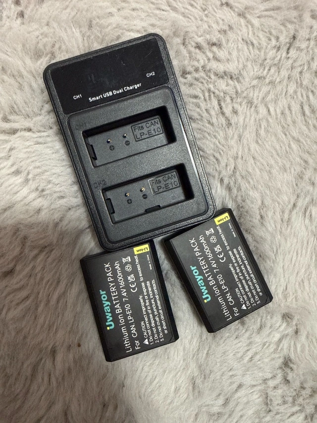 Selling a charger and 2 batteries for a Canon T7 camera. They are in good condition and ready for a new home. Battery type: Li-ion, Voltage: 7.4V, Capacity: 1600mAh. Asking $35 for the set. If the ad is still up, it's still available. Meet up in the STC or Scarborough area. Cash or e-transfer accepted.
