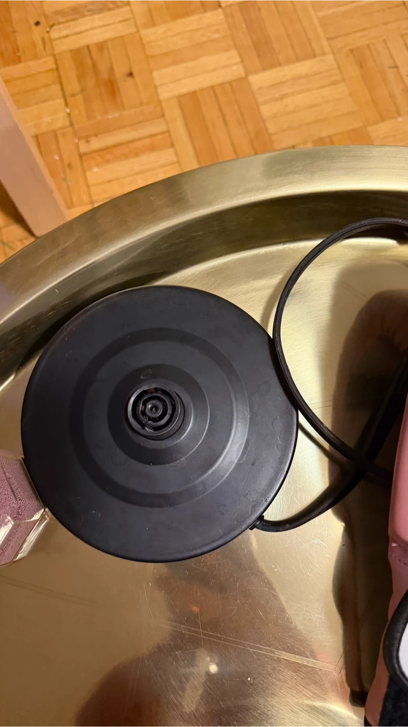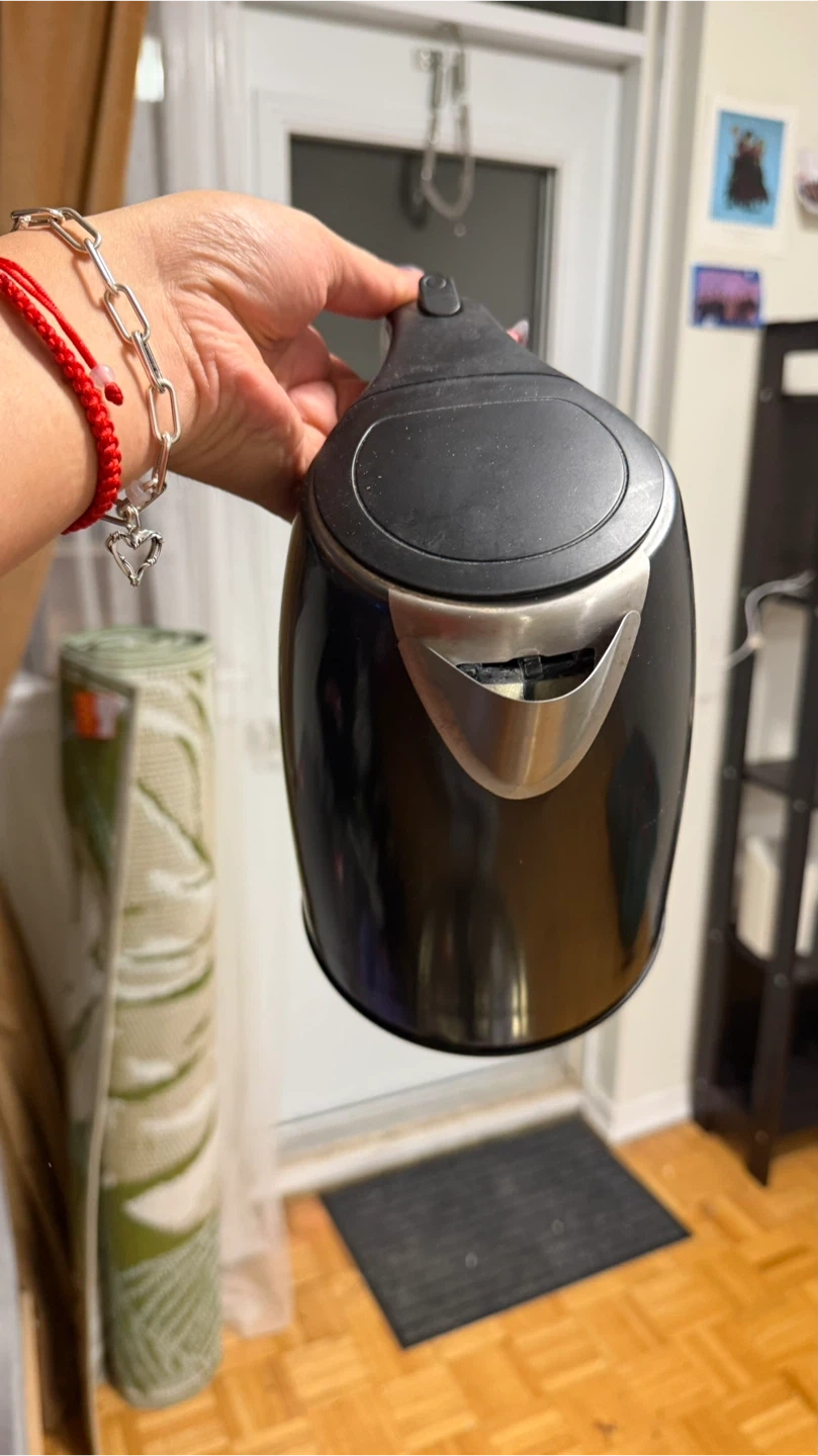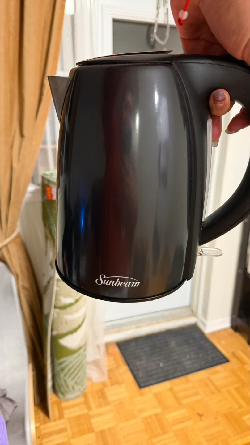 This is a black Sunbeam electric kettle. It's a standard appliance for heating water. It's useful for making tea, coffee, or other hot beverages quickly.