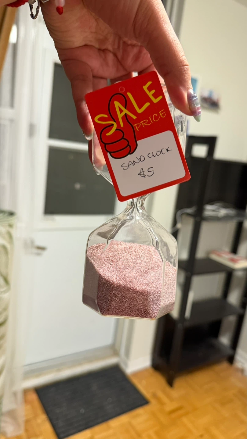 Glass sand timer filled with pink beads. It's a fun decorative item for any desk or shelf! This timer is great for setting quick reminders or adding a touch of whimsy to your space.