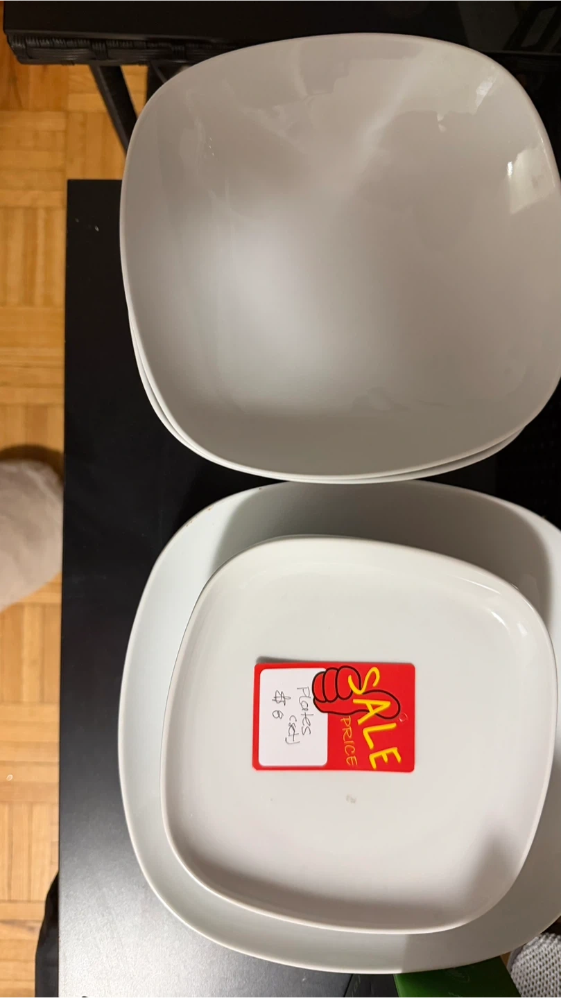 This is a set of sixteen white plates (5 small - 5 large - 6 bowls) . They're made of durable ceramic material. These rectangular plates are perfect for serving meals or as a stylish addition to your dinnerware collection!