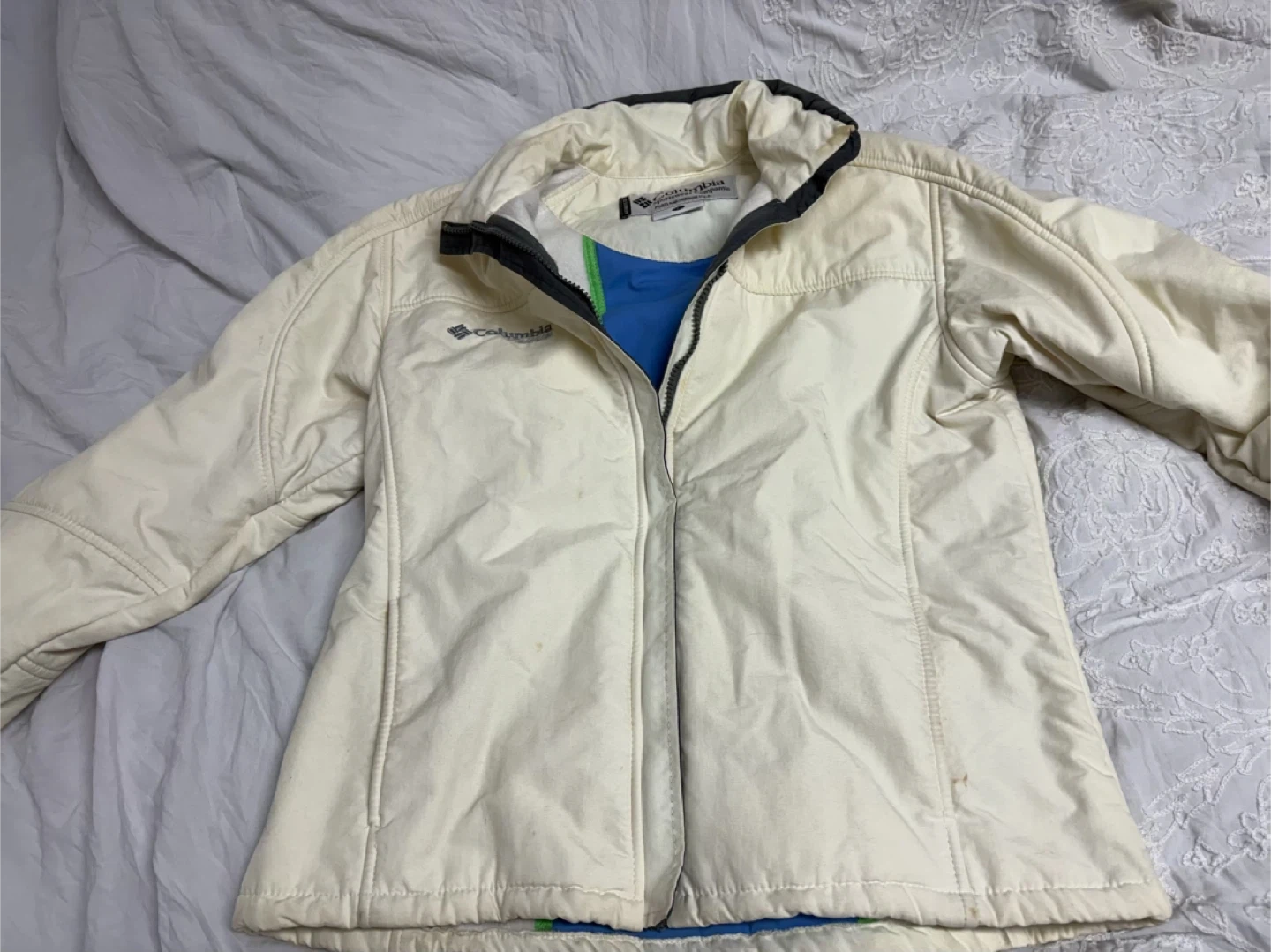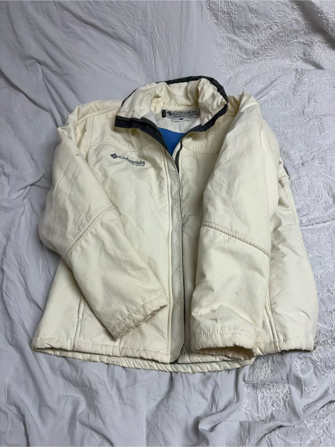 Columbia Sportswear Company jacket in off-white. It's a size large with a blue interior lining. Great for cooler weather! Size large pick up cash only