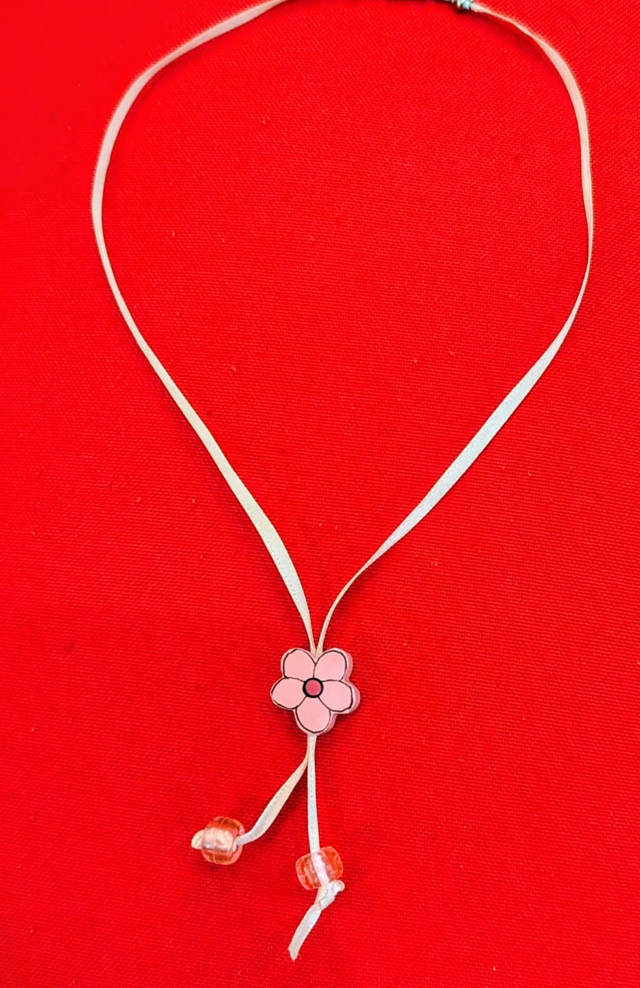 A cute necklace featuring a light pink flower pendant with a darker pink centre. It hangs on a thin pink ribbon with two clear beads near the ends. This is a lovely accessory for adding a pop of colour to an outfit!