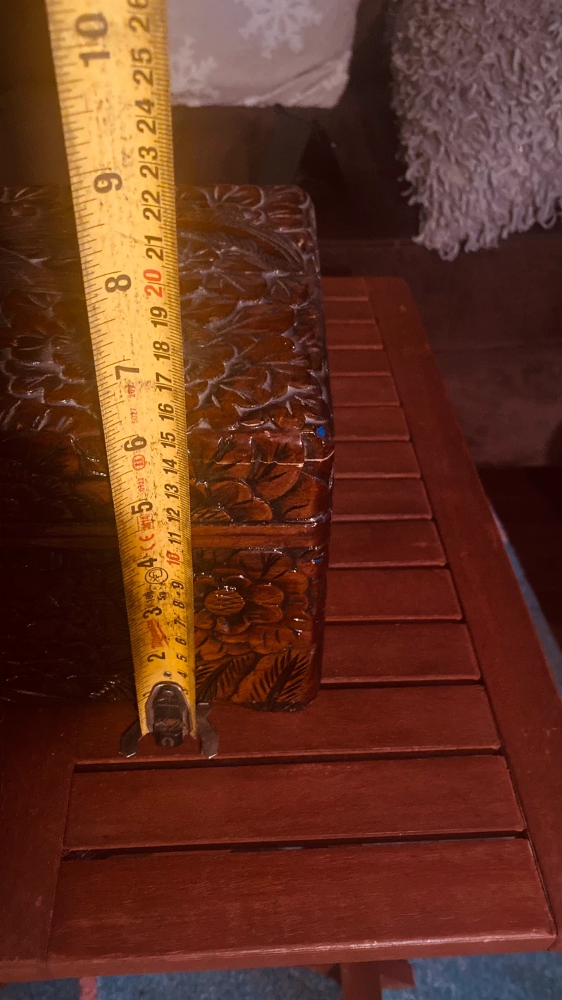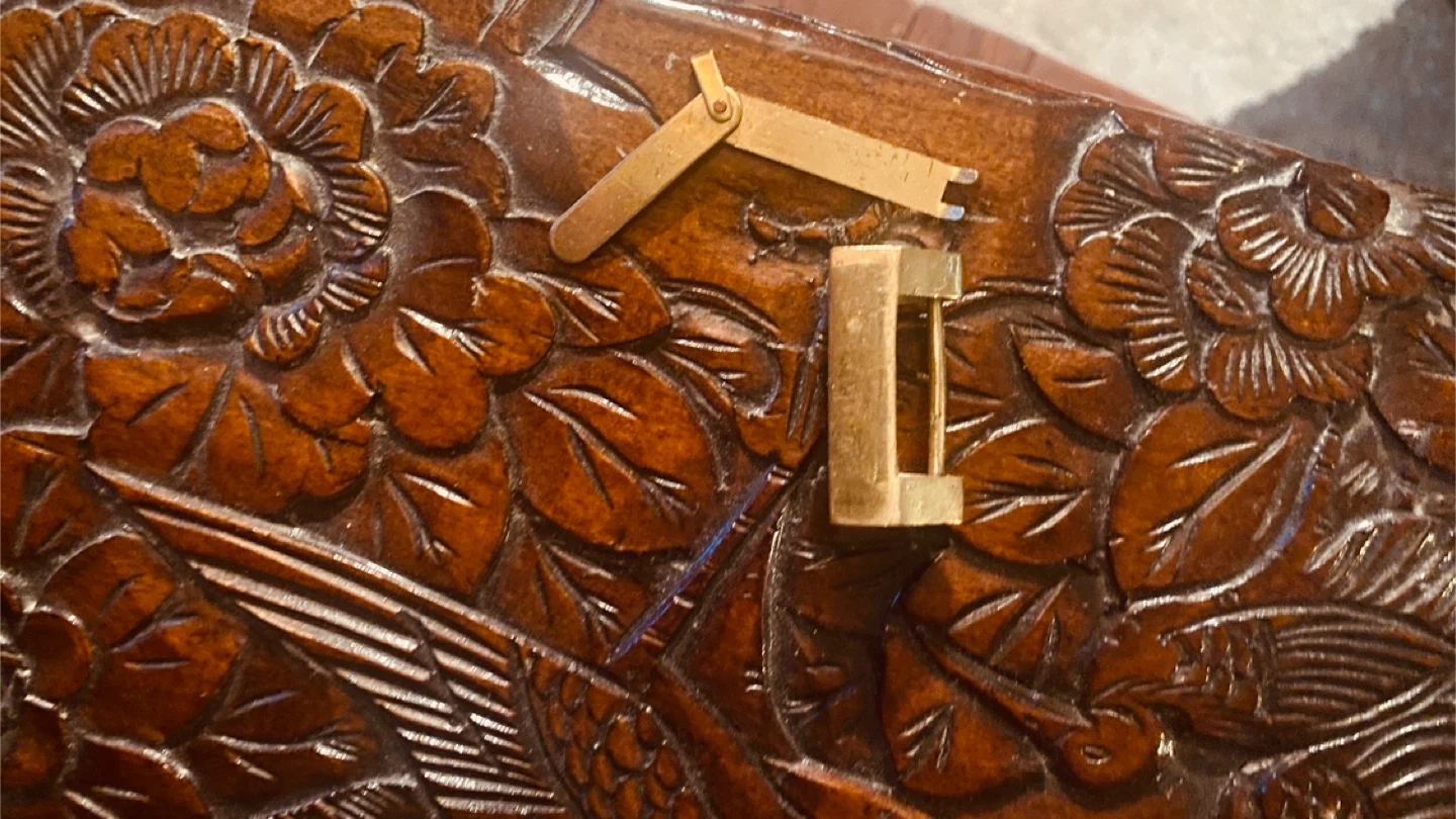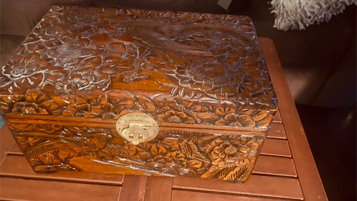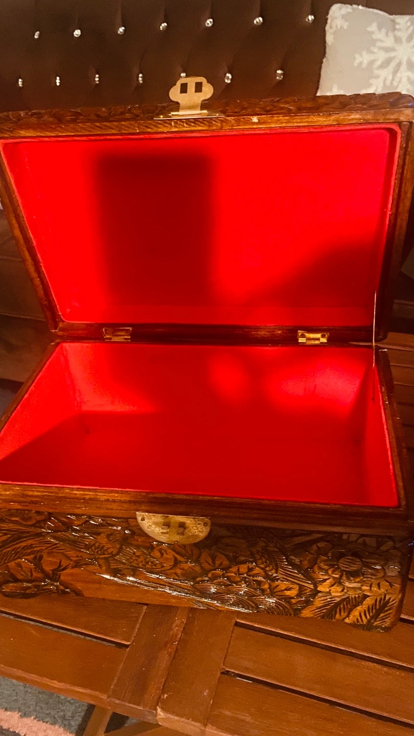 Beautifully carved wooden box featuring intricate floral and bird designs. It's lined with red fabric and comes with a small ornate latch. Approximately 10 inches long and 5 inches tall.