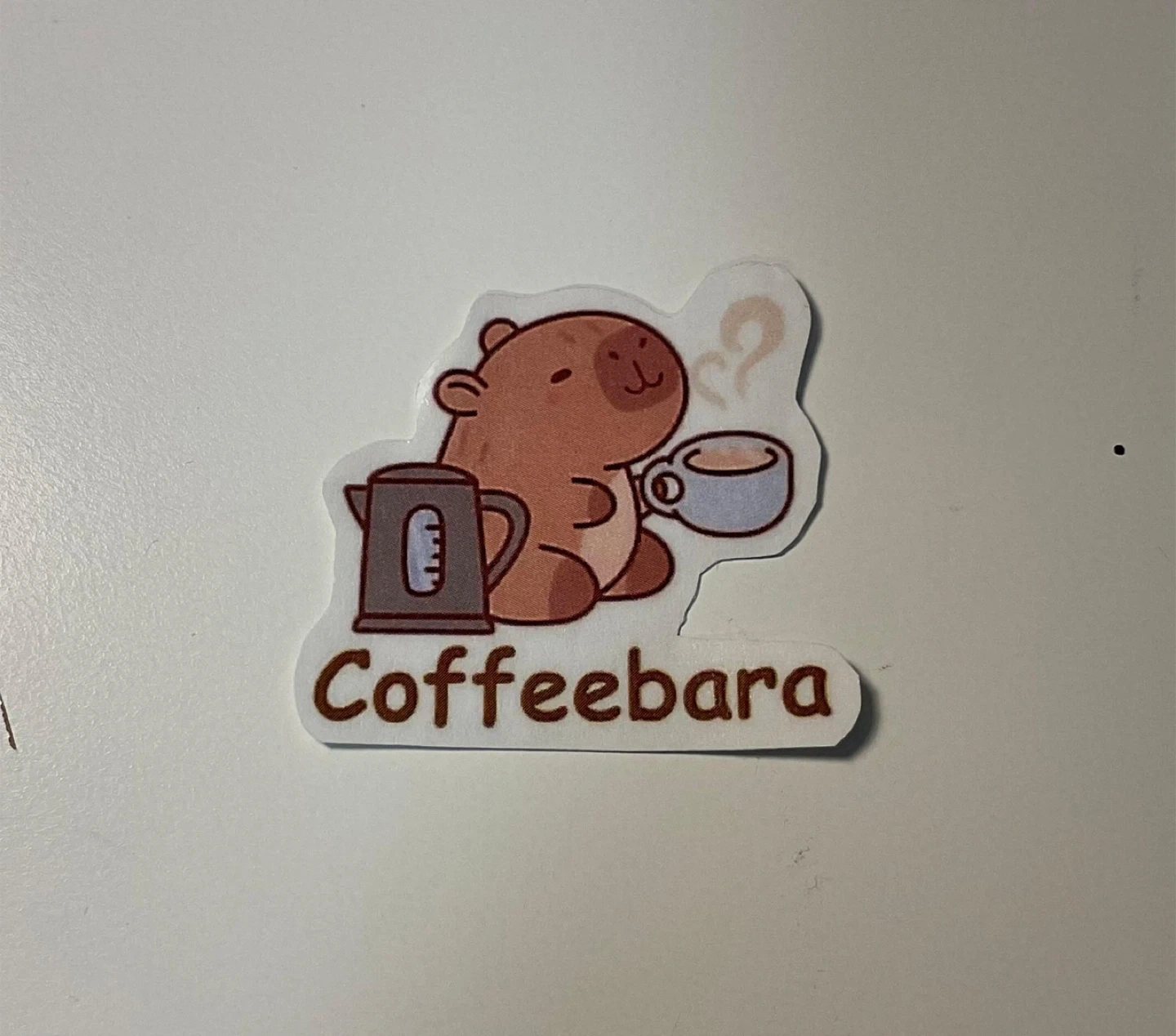 This one is a cute "Coffeebara" sticker featuring a capybara with a cup of coffee and a kettle. It's a fun sticker for decorating laptops, water bottles, or journals. Waterproof | Nontoxic | doesn’t leave any glue residue.