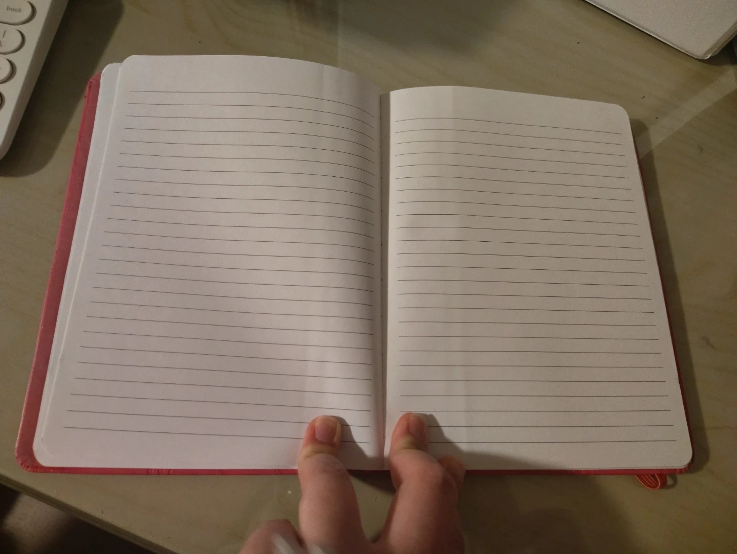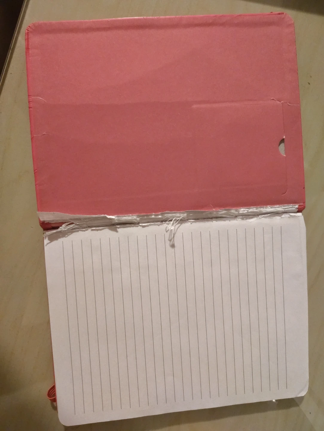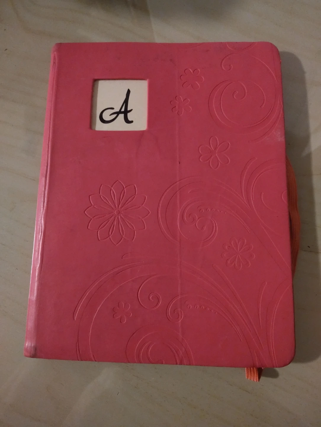 This is a pink journal notebook with a decorative cover and the letter "A" embossed on the front. It's lined and ready for your thoughts. Perfect for jotting down notes or daily entries! It's a bit ripped on the edges. Not good looking but still works as a note taking book.