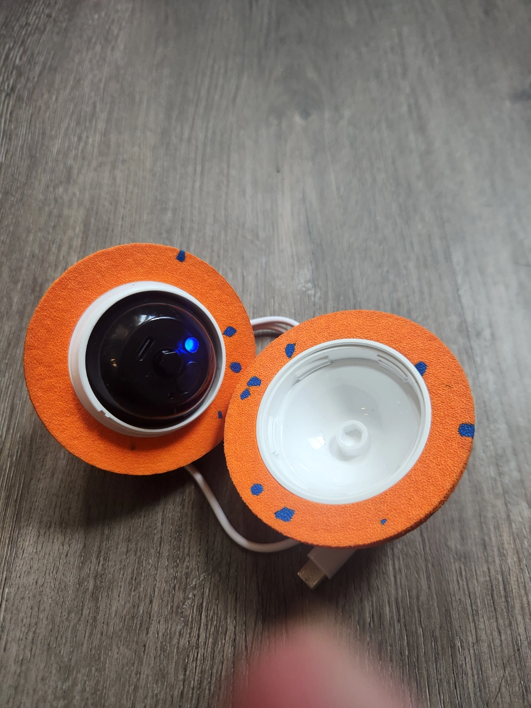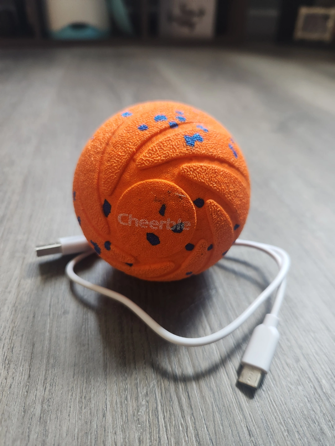 Orange interactive dog toy. Rechargeable via USB. Fun for pets, has 3 different modes of movement. Basically new, my dog played with it once and did not like it anymore