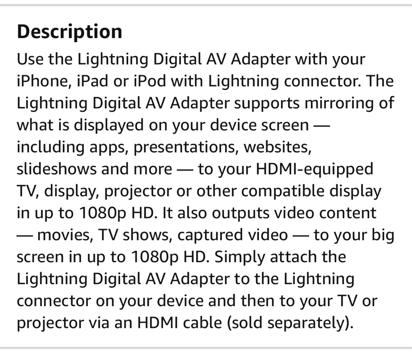 Connects your Apple device with a Lightning connector to an HDMI-equipped TV, display, projector, or other compatible display. Outputs video content in up to 1080p HD. HDMI cable sold separately.