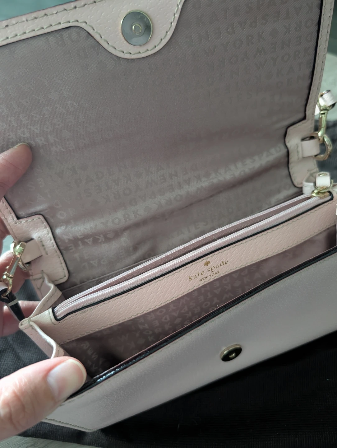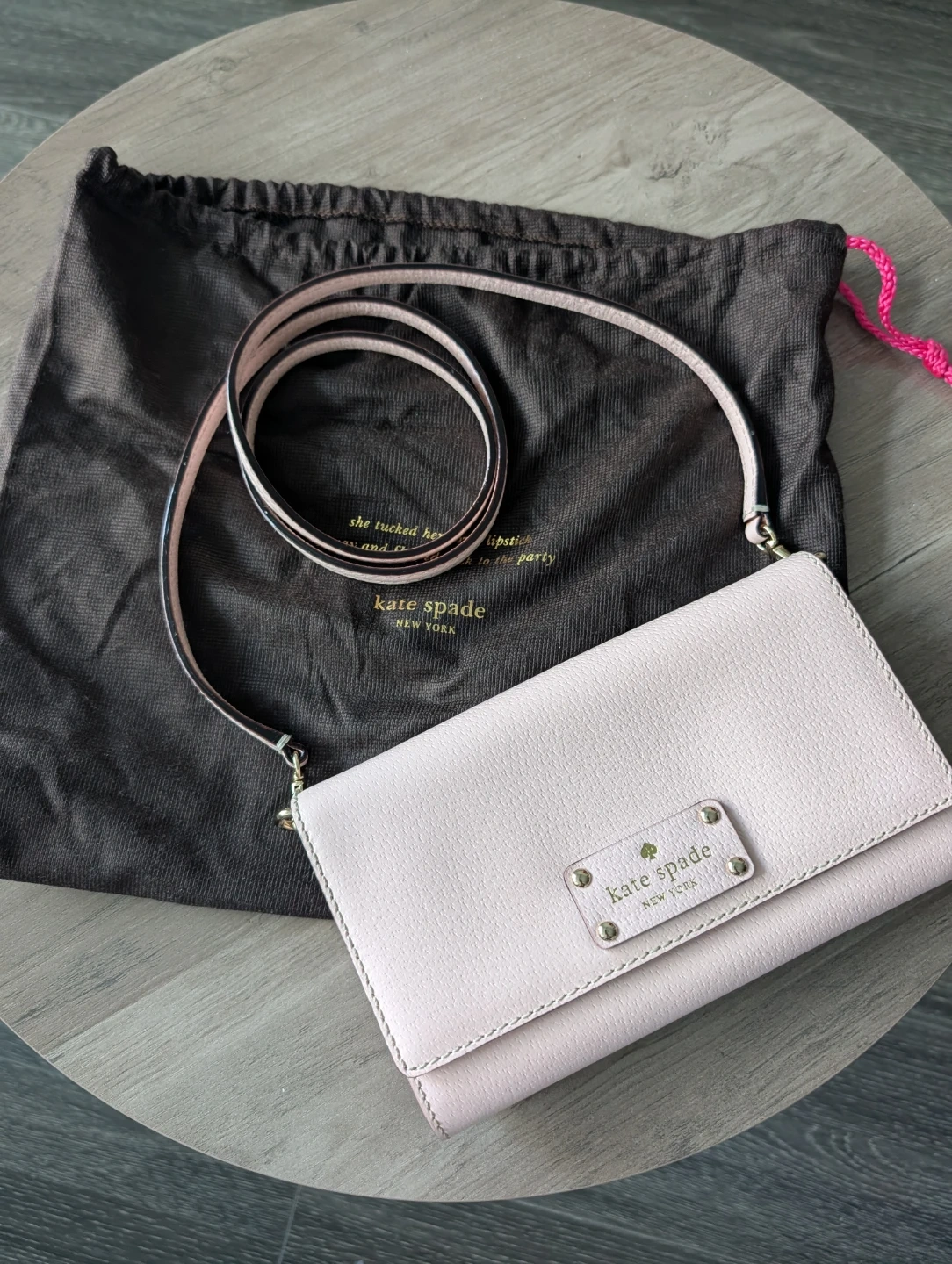 A chic pink leather crossbody from Kate Spade New York. It features a main compartment and a zippered pocket inside. Comes with a dust bag.