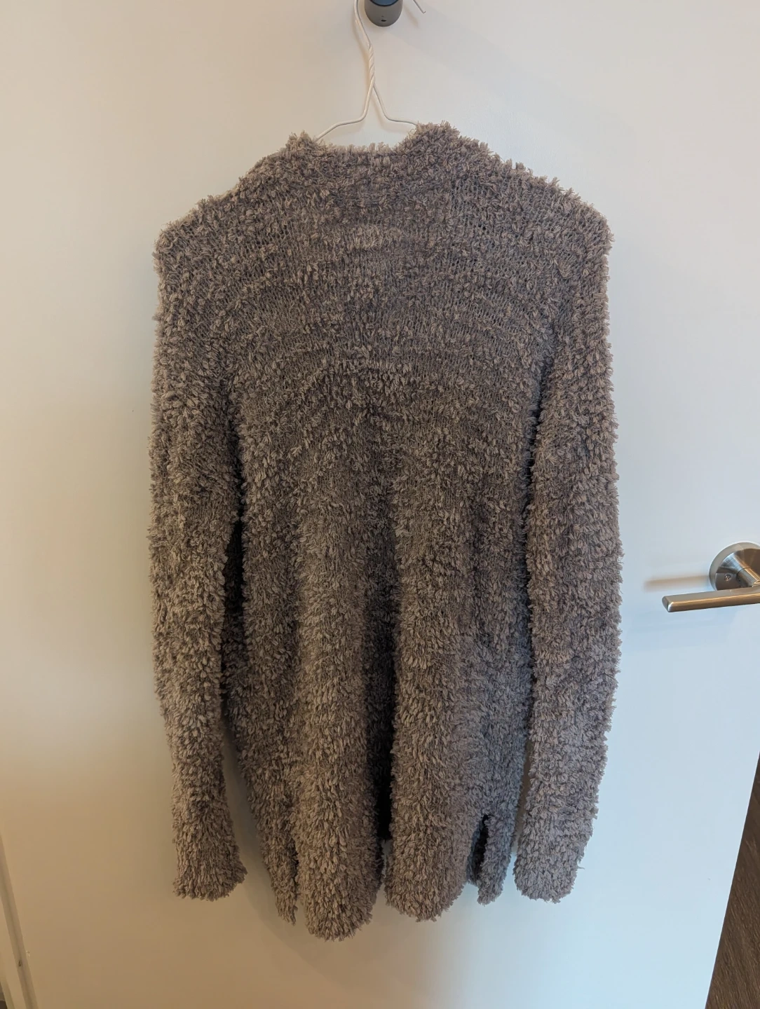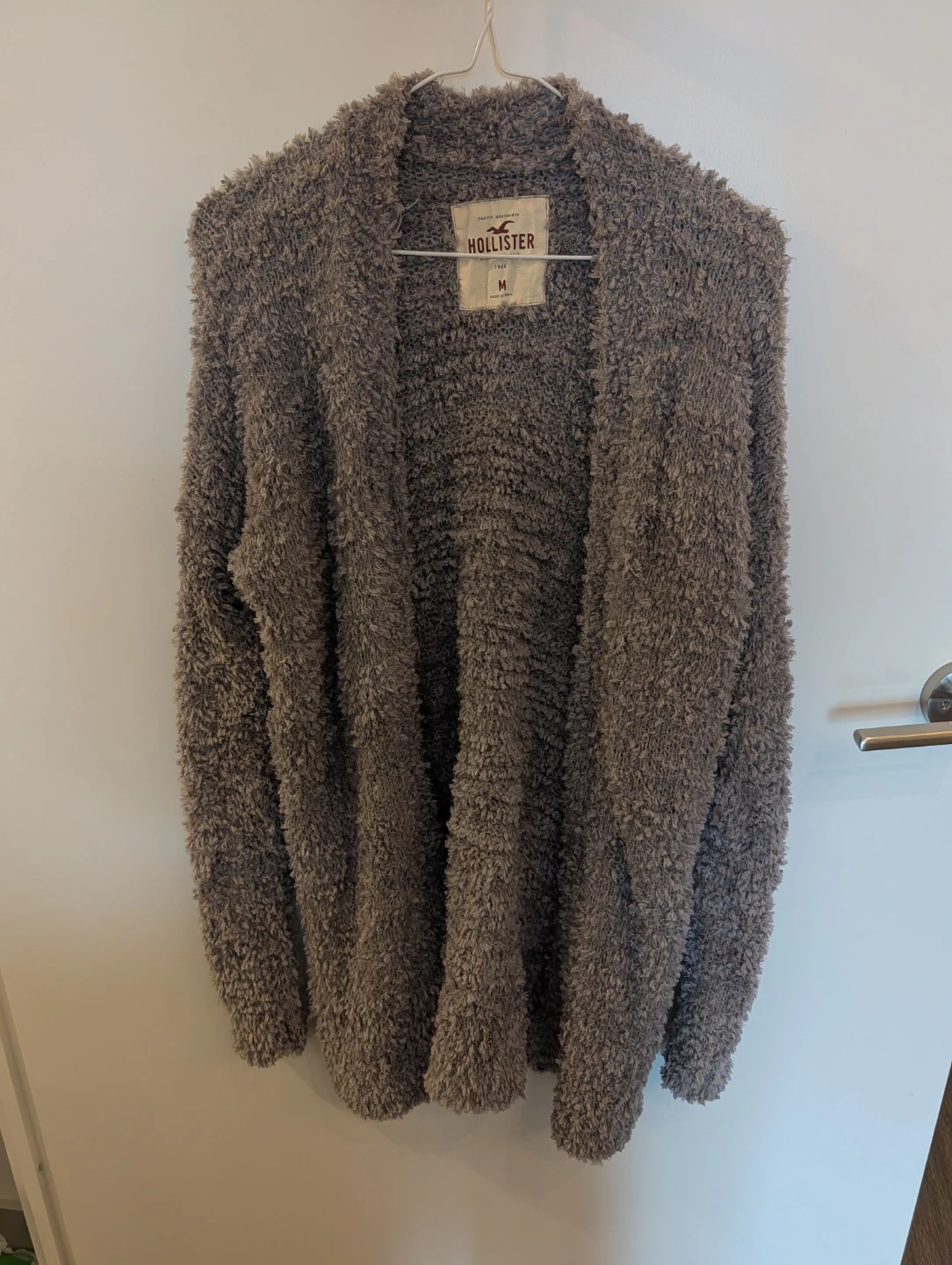 Super soft and cozy fuzzy knit cardigan from Hollister. It's a stylish grey colour. This sweater is a size medium.