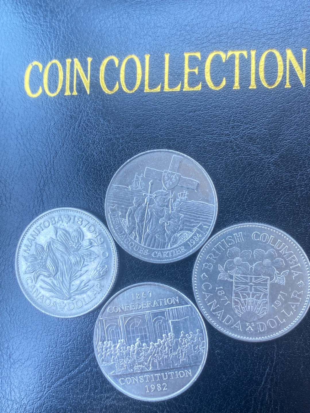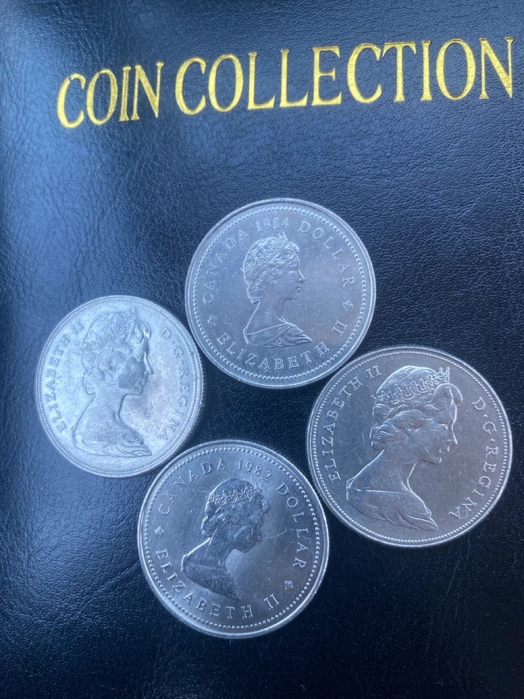 Four Canadian dollar coins featuring Queen Elizabeth II and various historical Canadian scenes. Includes coins from 1984, 1982, and others dated to the 1800s and 1970s. A nice addition for any coin collector!