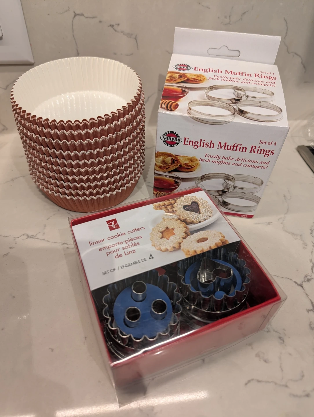 Includes English muffin rings, cookie cutters, and 4” tart liners (approx 40 pieces)