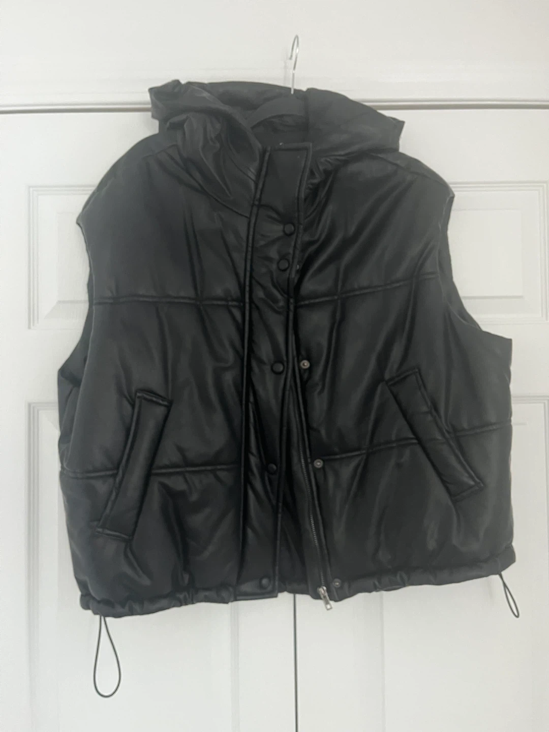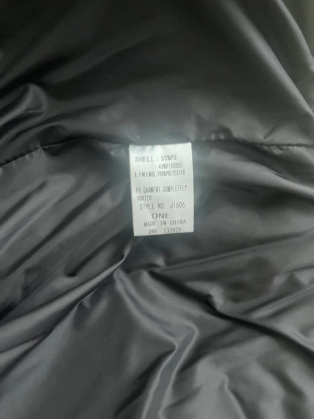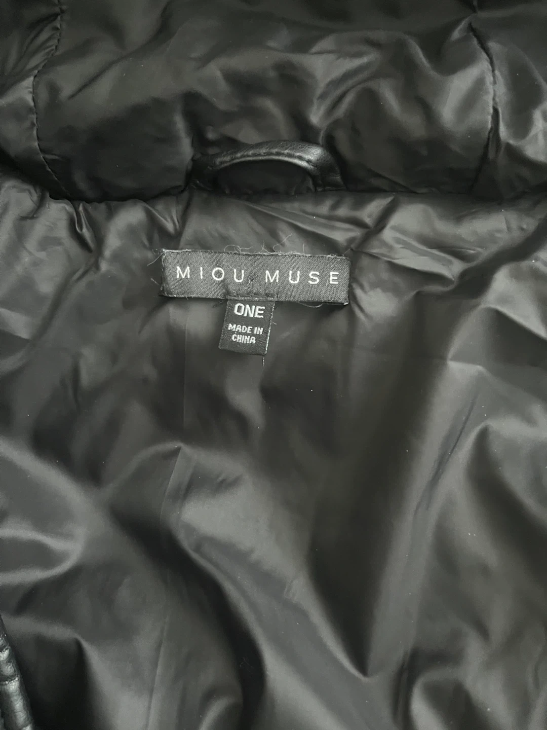 This black puffer vest is from MIOU MUSE. The shell is 55% PU coated and 45% viscose, with a 100% polyester lining. It's a Size ONE, made in China. Hand wash cold, do not bleach, do not tumble dry, hang dry.