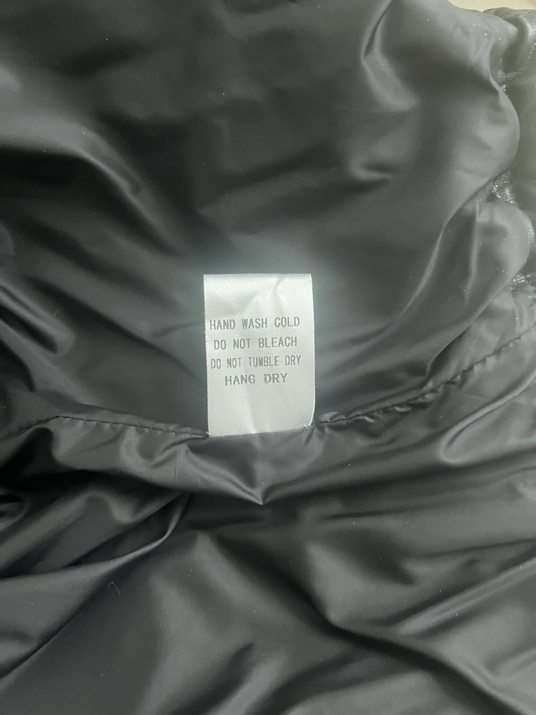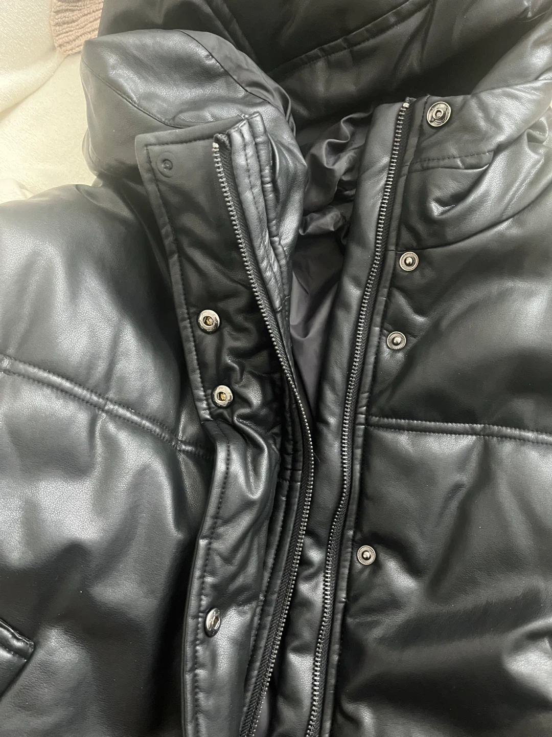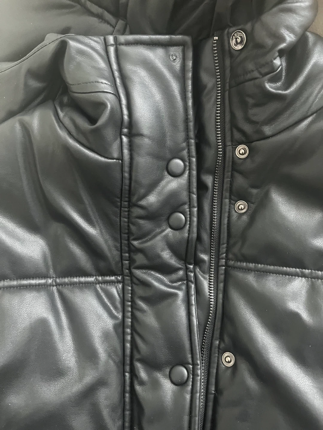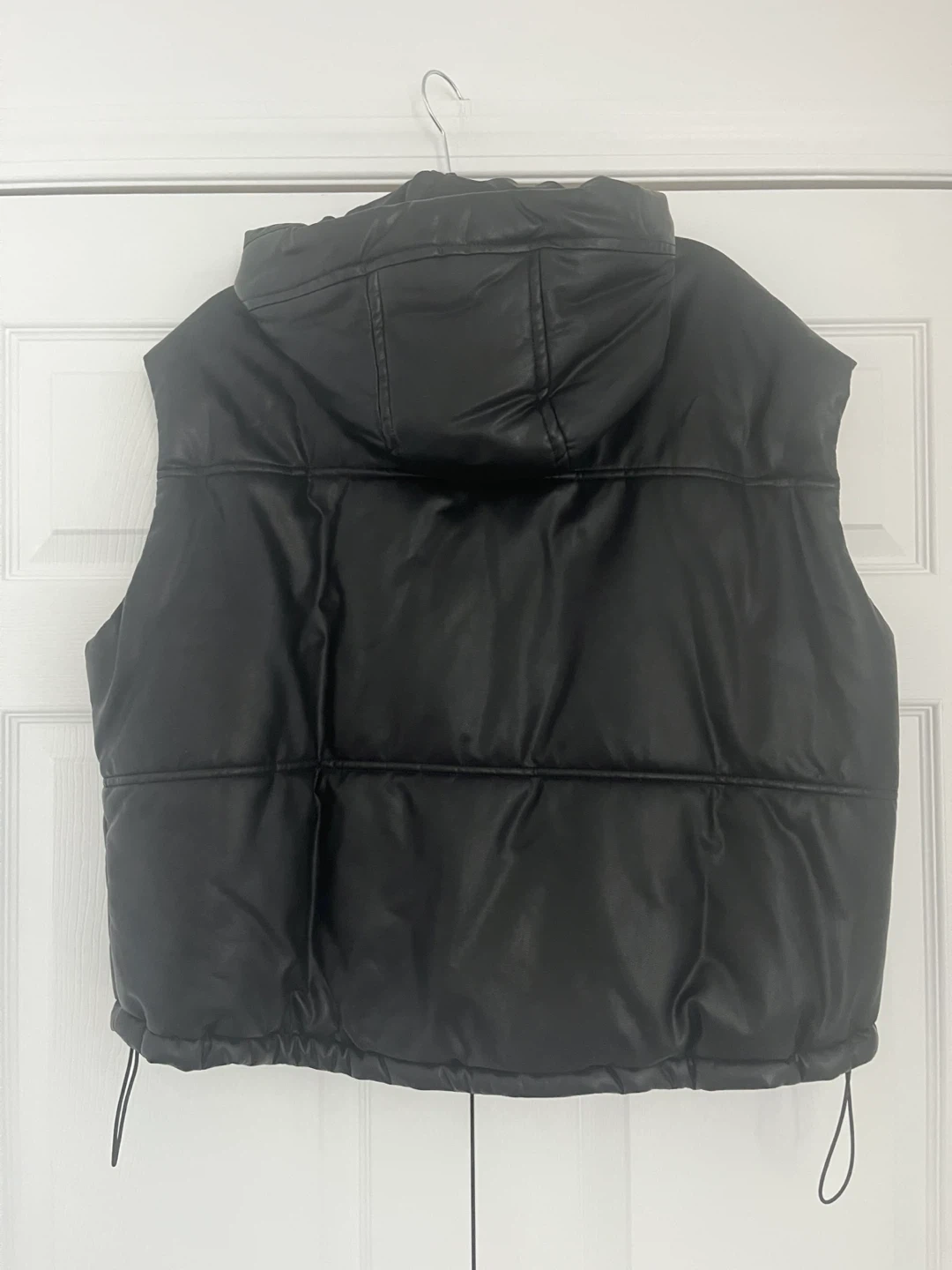 This black puffer vest is from MIOU MUSE. The shell is 55% PU coated and 45% viscose, with a 100% polyester lining. It's a Size ONE, made in China. Hand wash cold, do not bleach, do not tumble dry, hang dry.