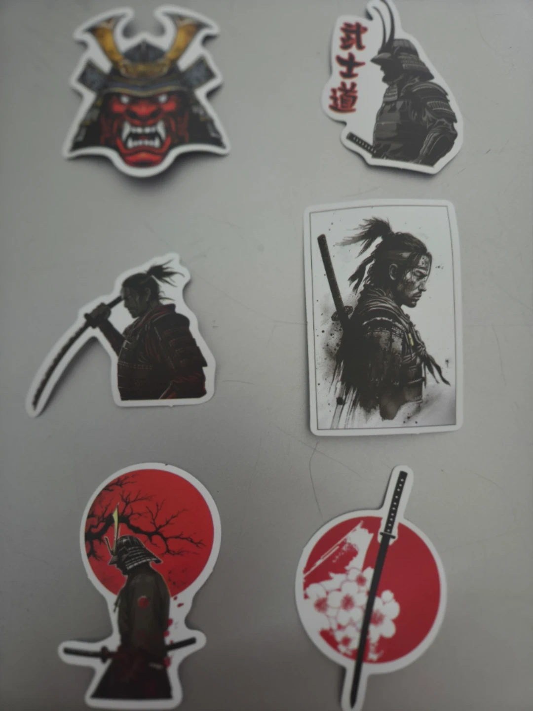 A collection of six stickers featuring Japanese samurai and floral designs. Includes a large peony sticker and five samurai-themed stickers with helmets, warriors, and cherry blossoms.