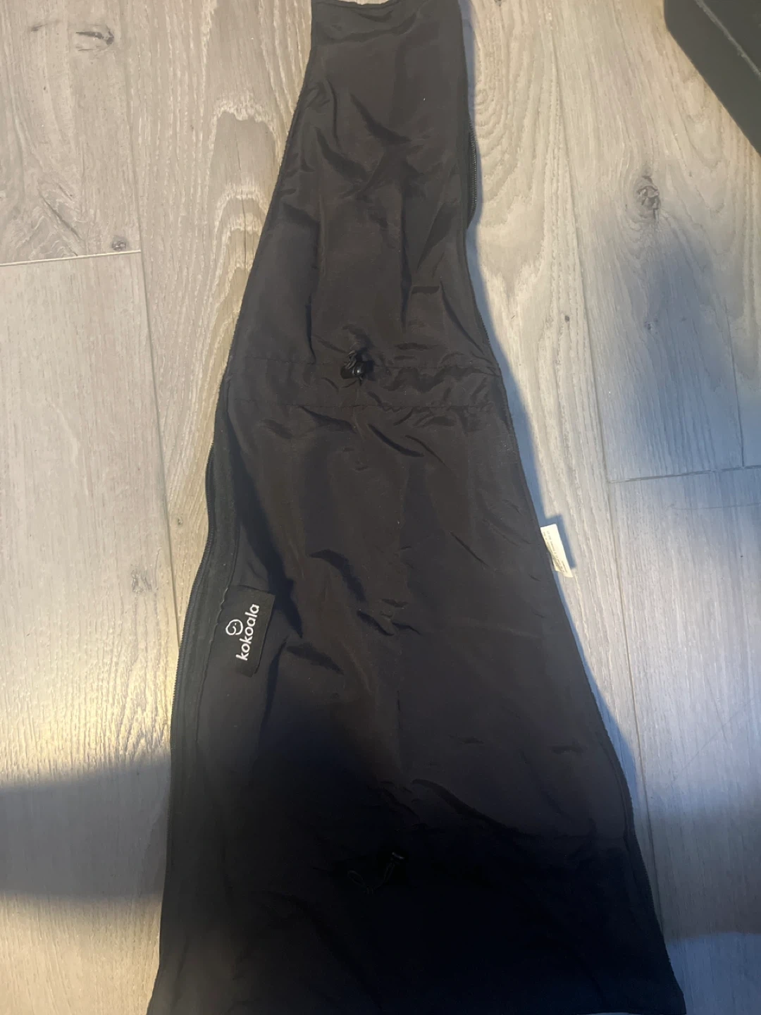 Black waterproof cover for a Kokoala baby carrier. It's designed to protect your little one from the elements. Also to help extend jacket in colder weather when pregnant. Material is water-resistant nylon.